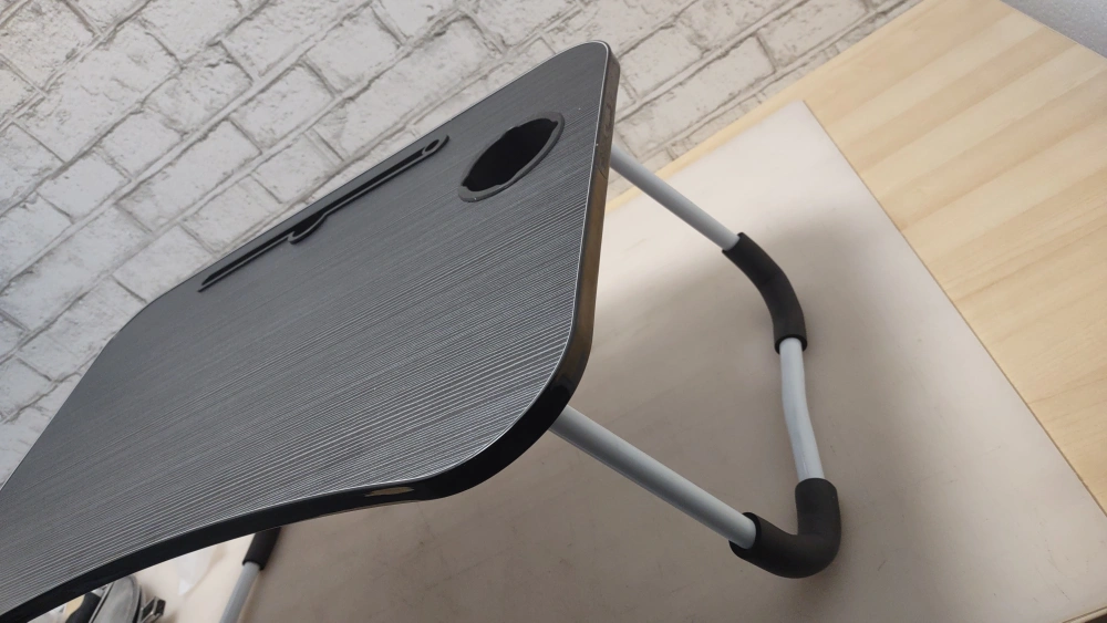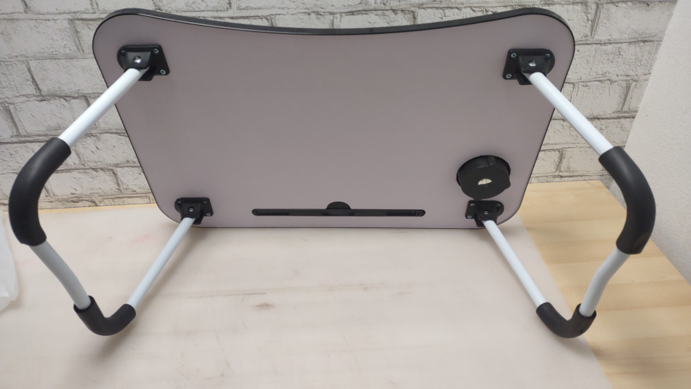 Foldable laptop table. Black top, white legs. Features a cup holder and a small storage slot. Perfect for working from bed or couch.