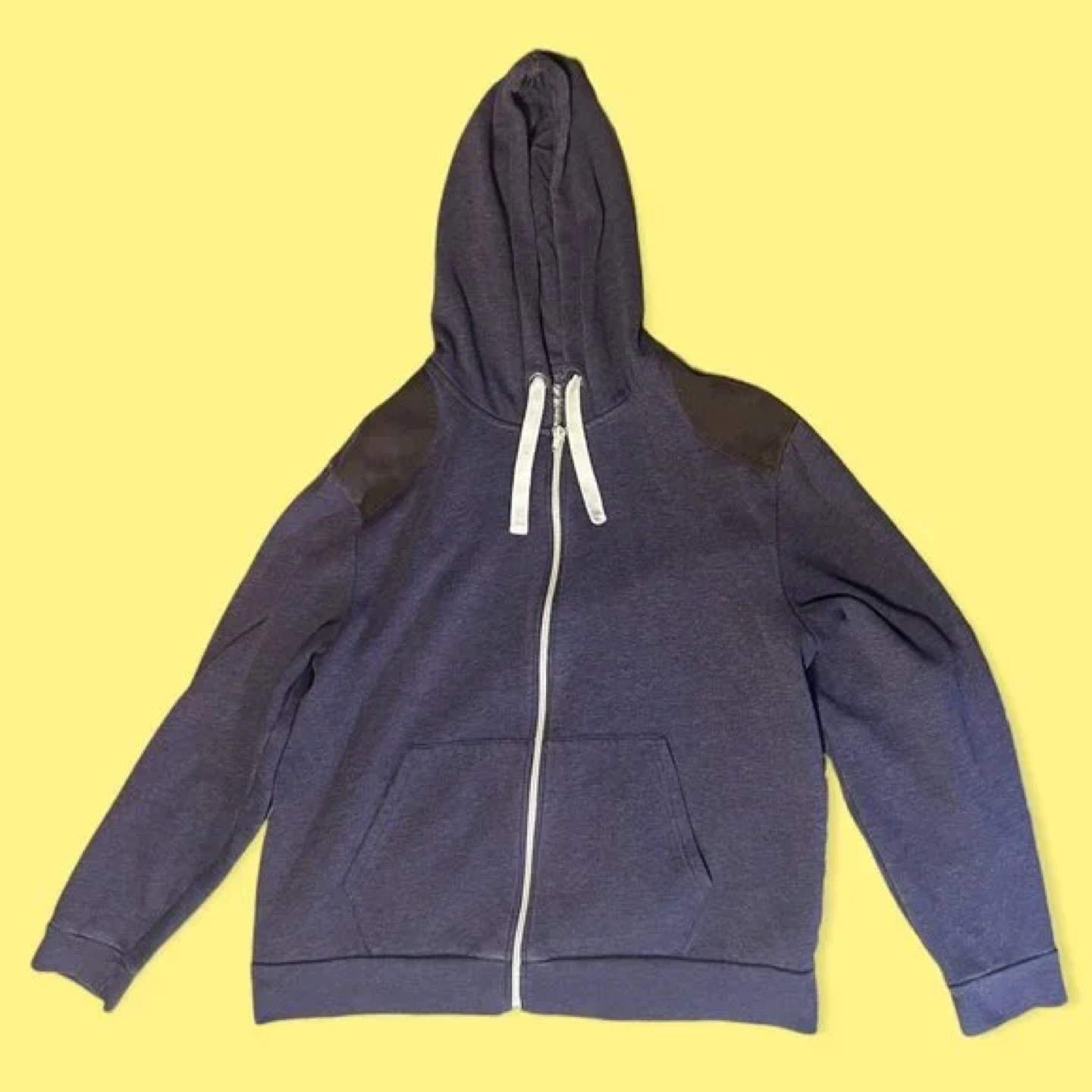 Men's dark purple zip-up hoodie. Features a hood and kangaroo pocket. Shoulder patches. Great for casual wear.