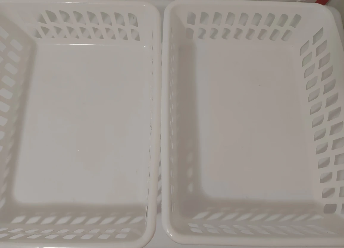 2 Large Organizing Baskets. 1 in excellent condition. 1 has a damaged handle area. Not noticeable if you are using them in a drawer or cabinet. Maybe 4 to 6 inches high. Good for storing cleaning supplies, large utensils, and more.