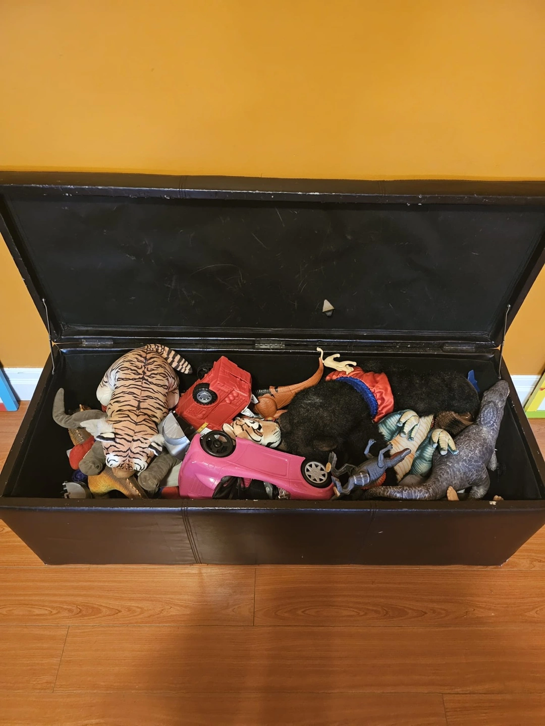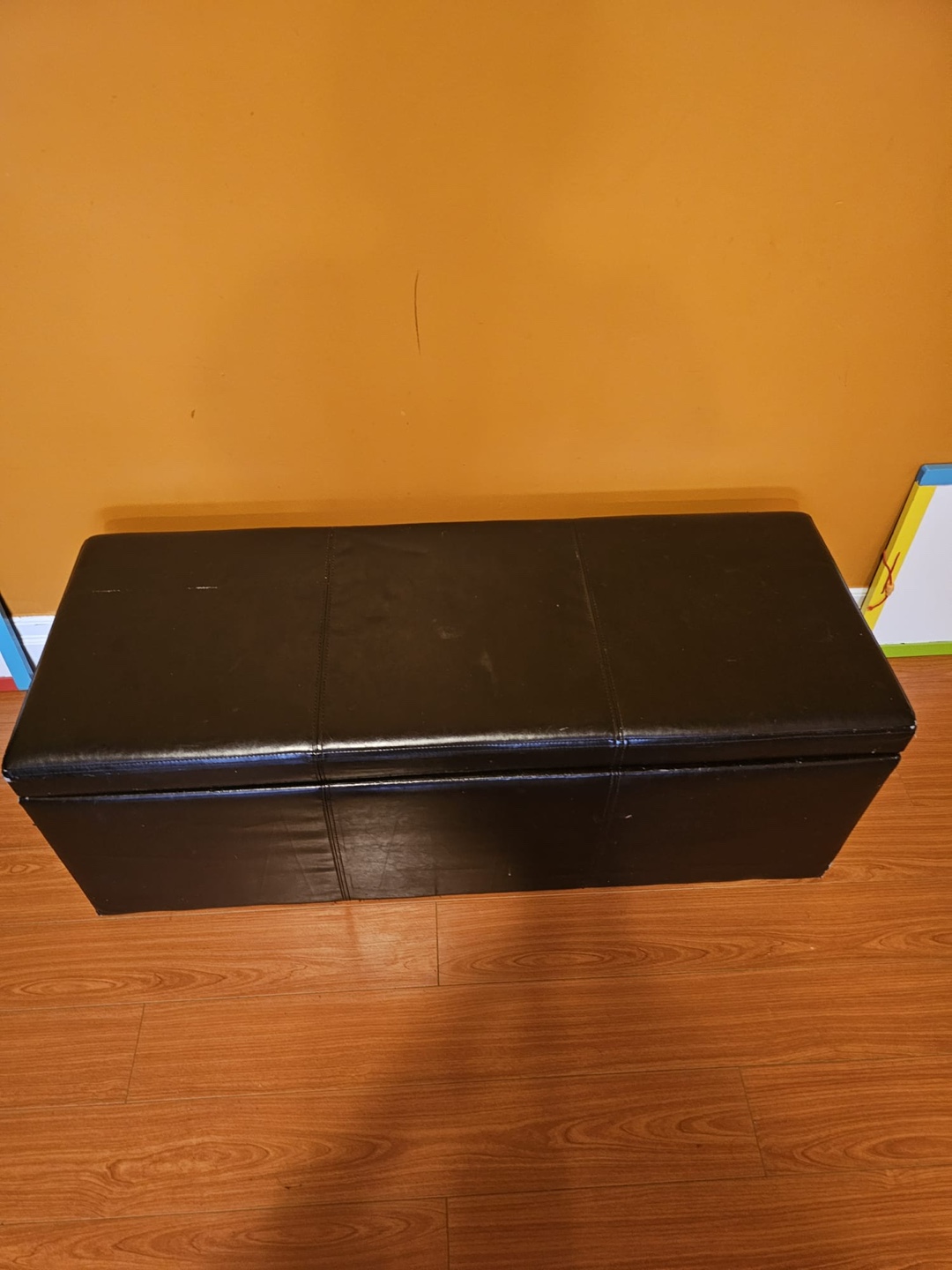 Black faux leather storage ottoman bench. Great for extra seating and toy storage. Spacious interior. Some minor wear