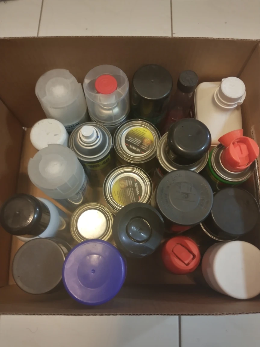 box of assorted aerosols, paints and chemicals from a motorcycle workbench. includes brake cleaner, engine cleaner, paints, clear coats, etc.