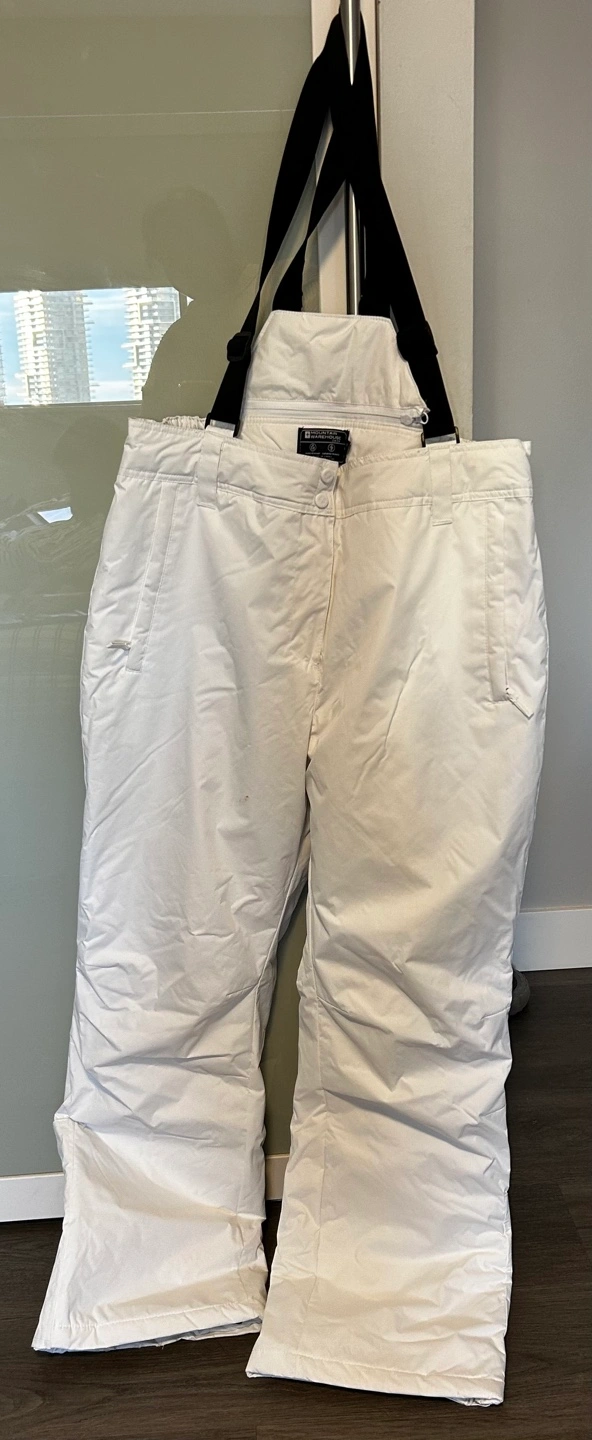 White women's ski pants. Size US 12, UK 16, EU 44. Water resistant and offer isothermal warmth. Adjustable suspenders. Made in China. Some minor dirt marks.