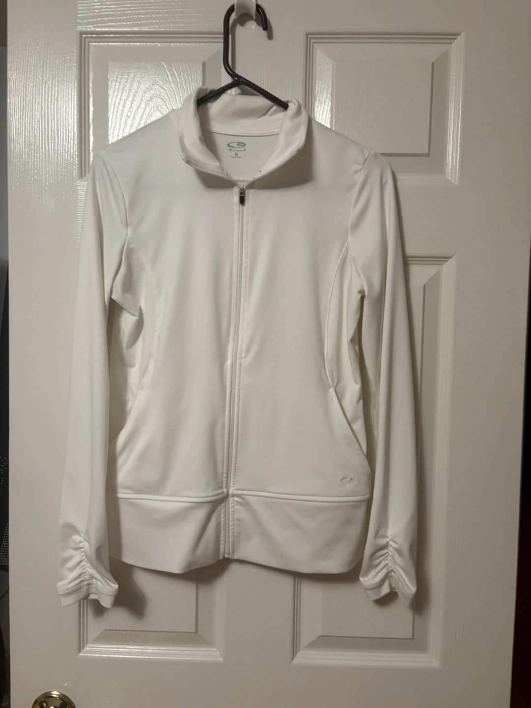 White zip-up jacket. Long sleeves with ruched cuffs. Small size. Perfect for layering or workouts. Good condition smoking pot free home.