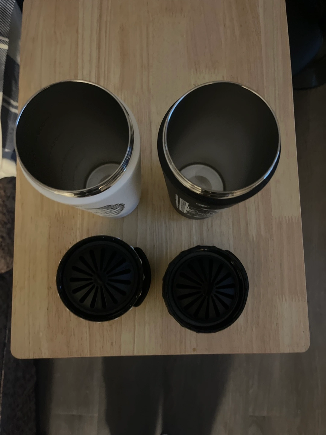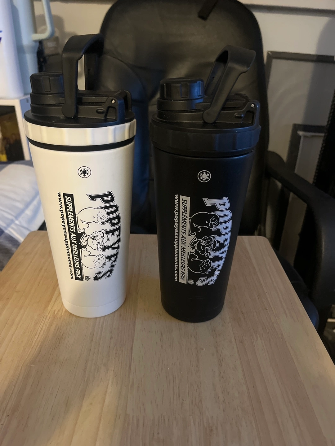 Two stainless steel protein shaker bottles. One black, one white. Popeye's Supplements branding. Includes mixing lids. 1 for $10
