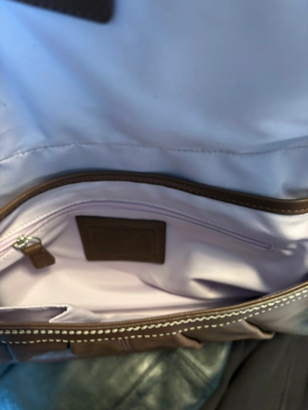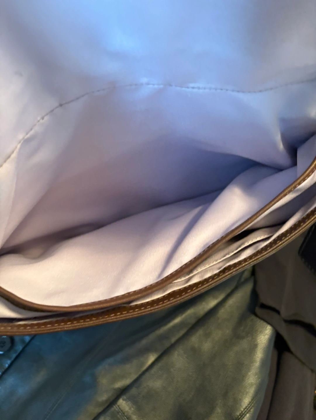 Vintage Brown leather handbag. Features a buckle closure and single shoulder strap. Interior features a zippered pocket and light purple lining. Excellent condition never used. F15204 smoke and pet free home.