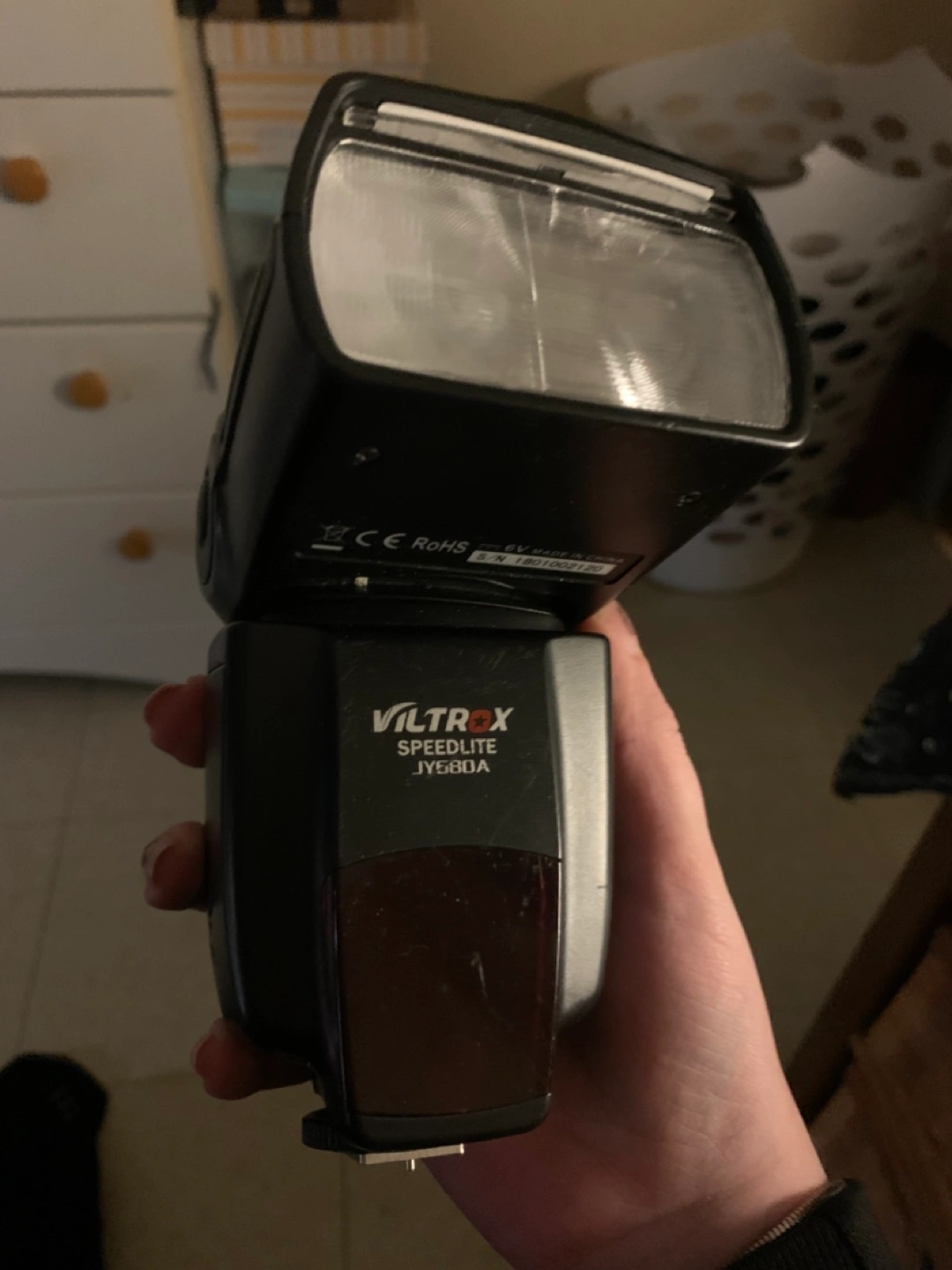 Used camera flash. Good condition. Compact and portable design. Includes flash head and battery compartment.