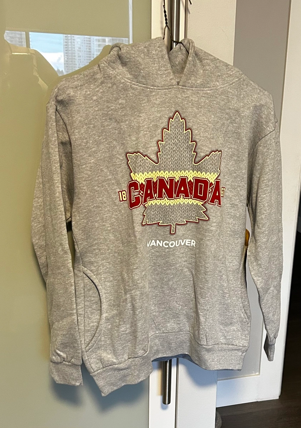 Grey hooded sweatshirt. Features a large embroidered maple leaf design with "Canada" and "Vancouver" text. Size large. New with tags.