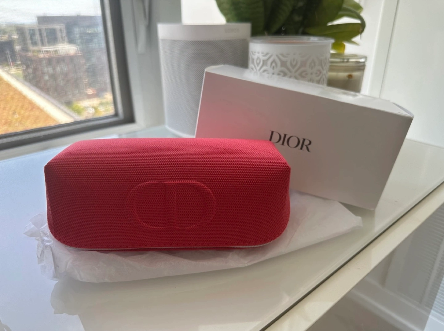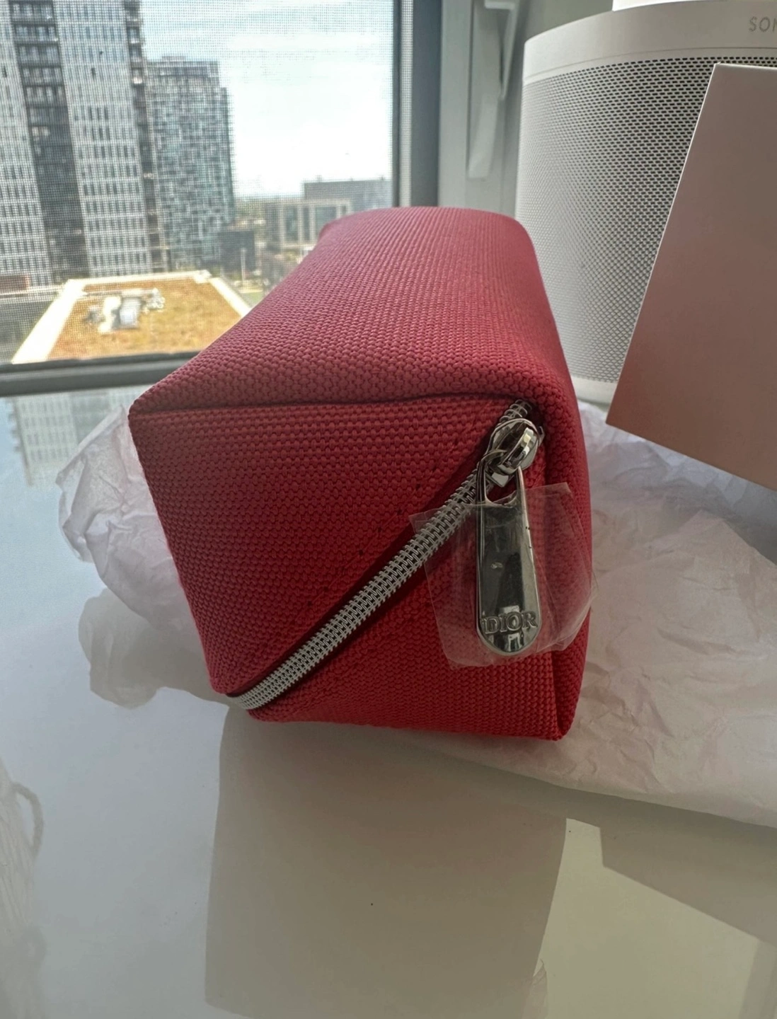 Brand new Dior cosmetic bag. Red canvas material. Silver zipper. Embossed Dior logo. Perfect for travel.