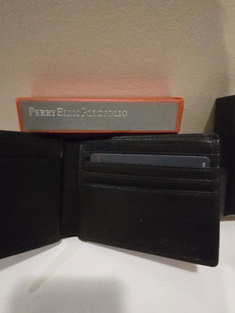 New Perry Ellis Portfolio bi-fold wallet. Black leather. Comes in original box. Multiple card slots and billfold.