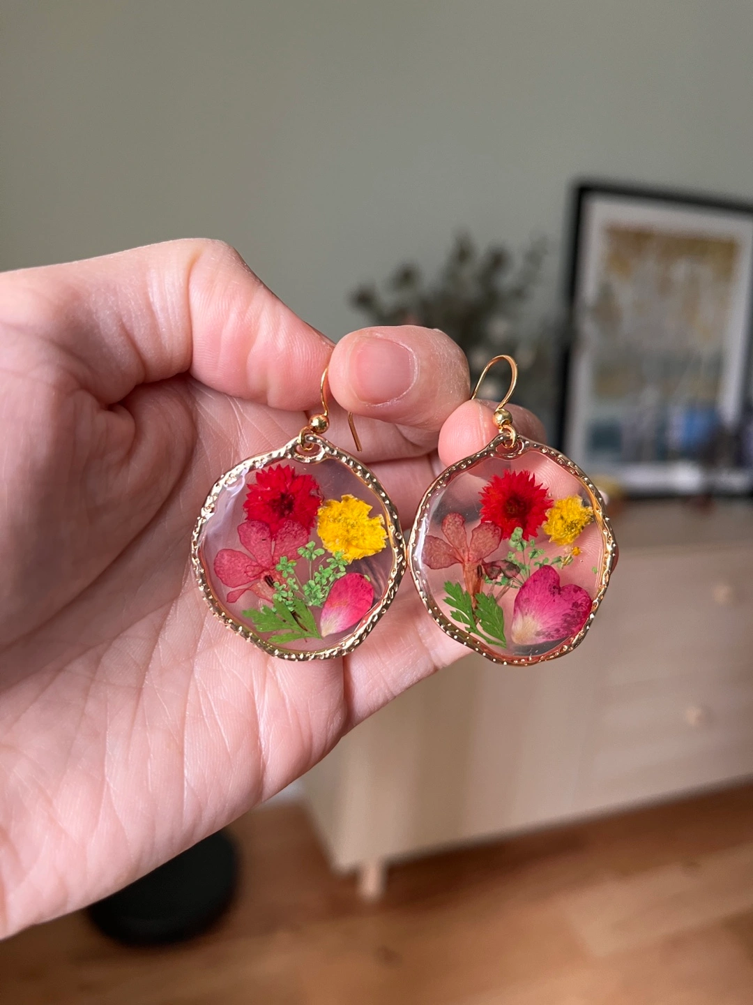 Gorgeous dangle earrings. Features pressed flowers encased in clear resin. Stainless steel hooks. Lightweight and eye-catching.