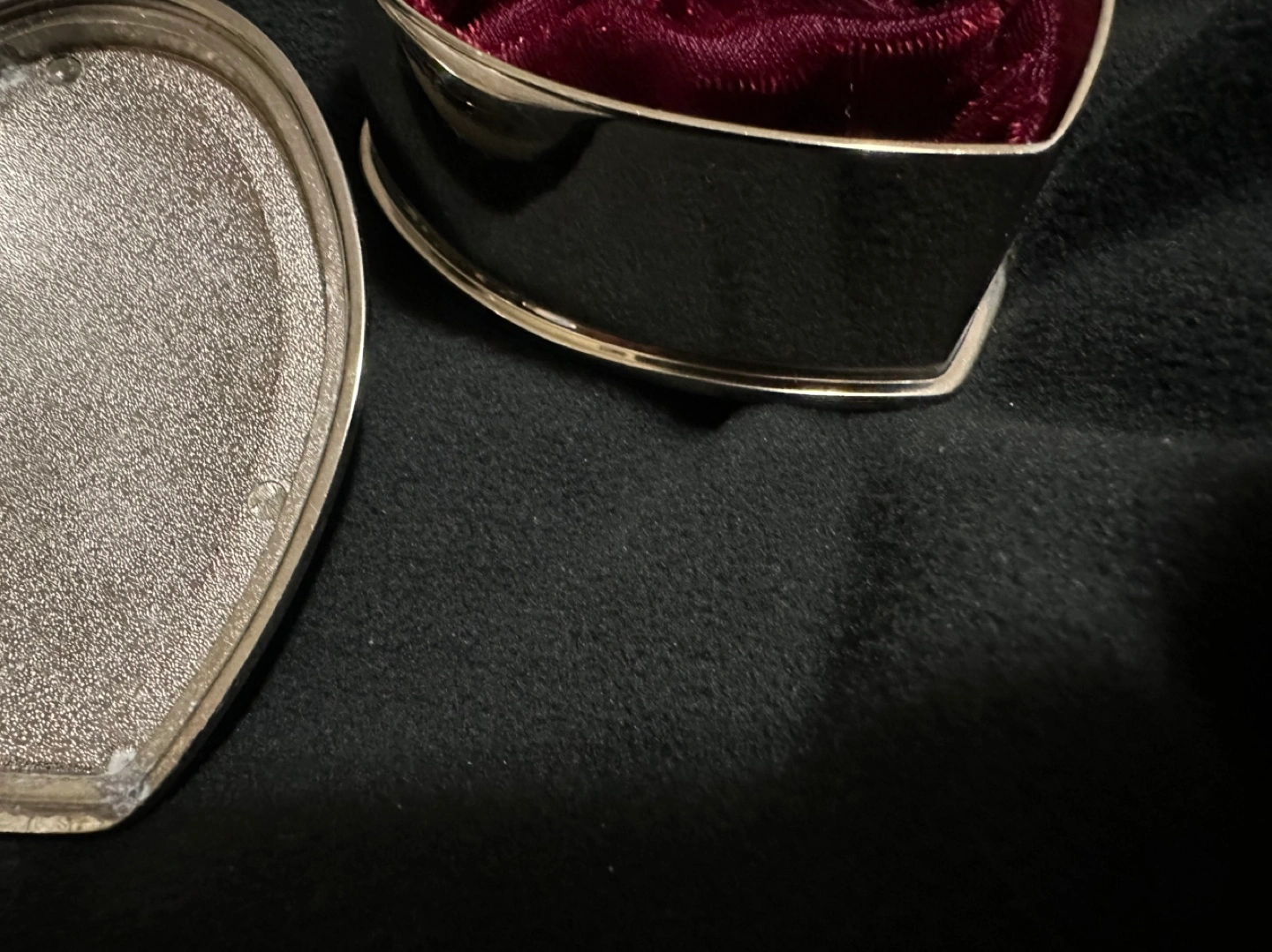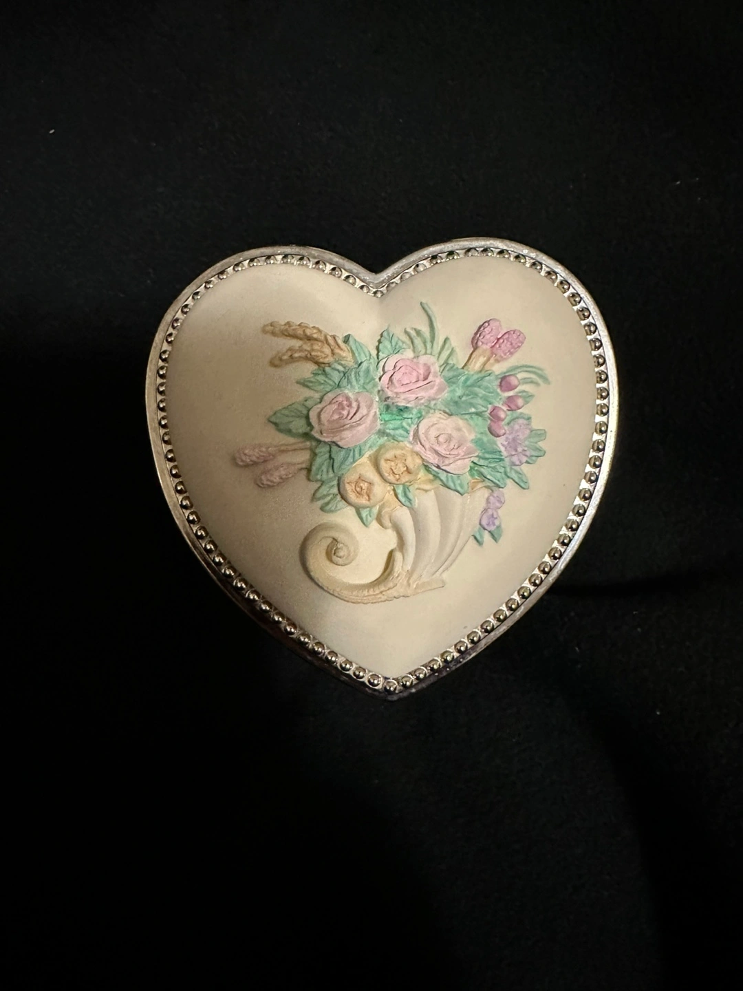 Heart-shaped trinket box. Silver-toned metal exterior. Cream-coloured ceramic inset with floral relief. Burgundy velvet interior. Perfect for storing small jewellery or keepsakes.