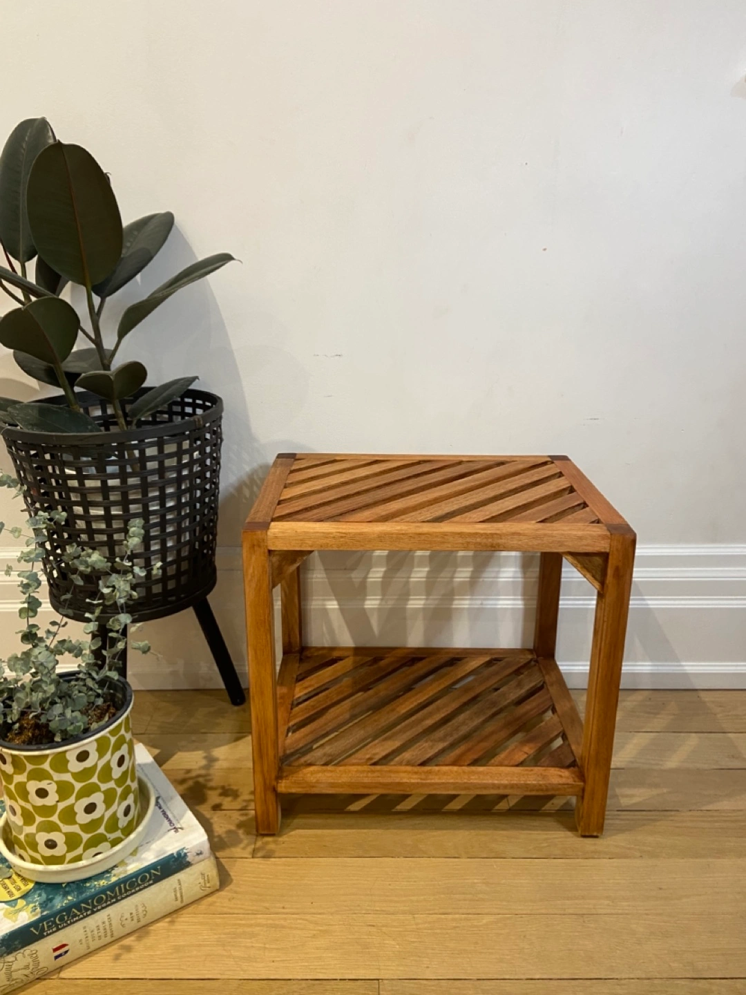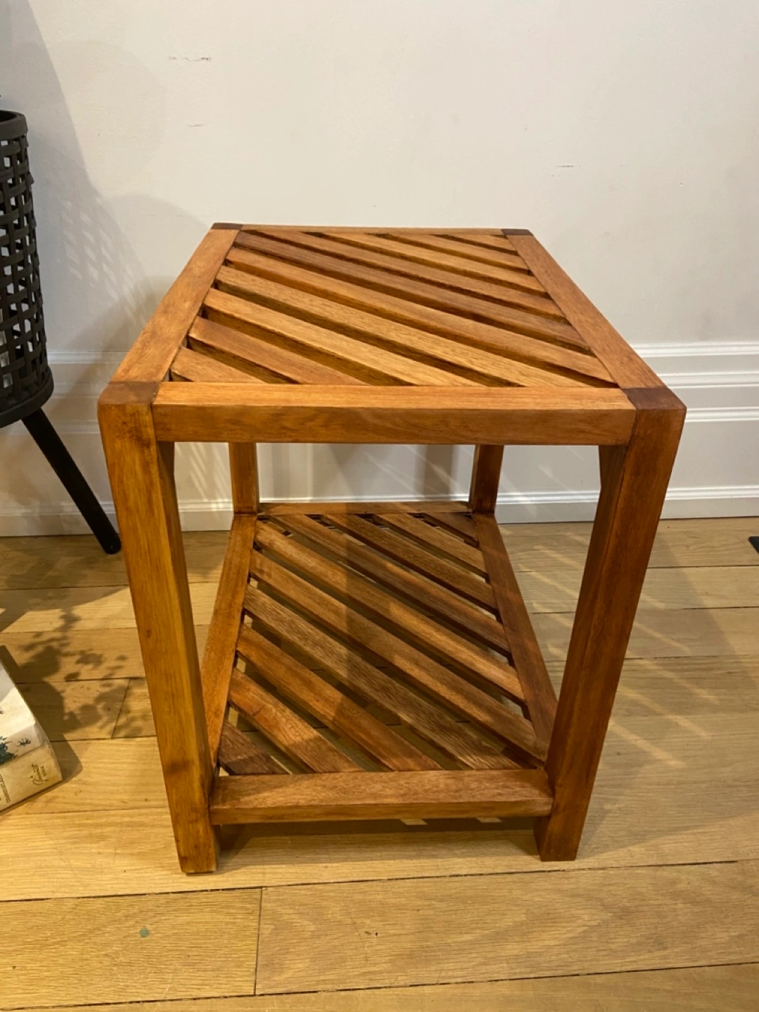 257Two-shelf wooden end table. Diagonal slatted shelves. Simple, minimalist design. Solid wood construction. Missing one tiny nub on bottom but sturdy and beautiful. Measurements: W: 17 3/4” D: 13” H: 17” Broadview and Danforth