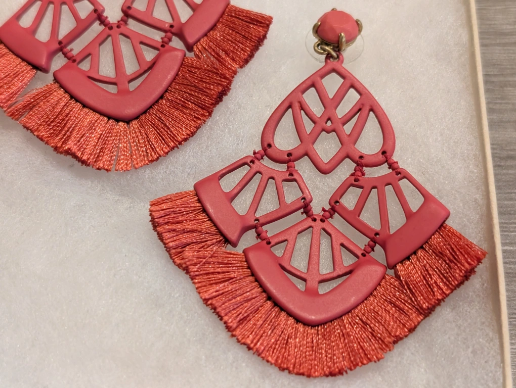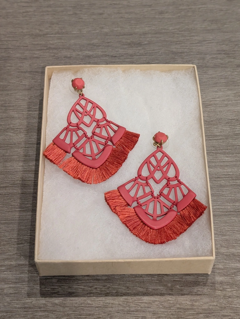 - gently used, only worn twice for special occasion - features a coral colour, intricate cut-out design, and long tassels. Gold-toned posts - retails for $79 Great for many occasions! Pick-up location: Yonge-Bloor St E Check out my other items! I would be happy to provide a discount, please don't hesitate to ask! :) If you have any questions, please let me know! Once sold, there will be no refunds.