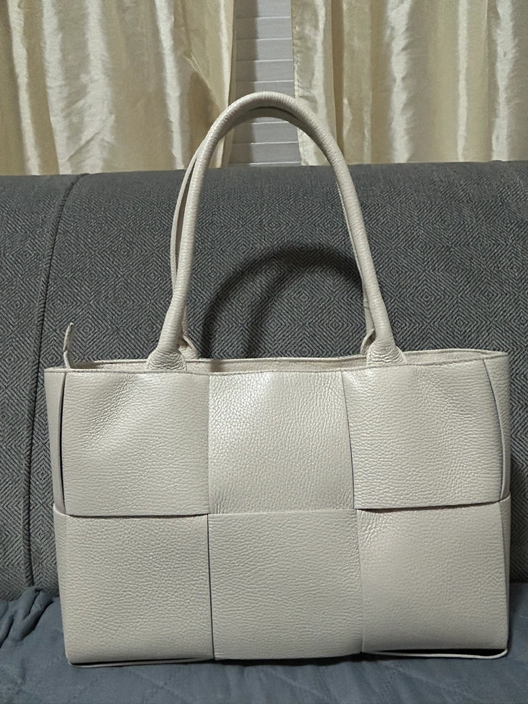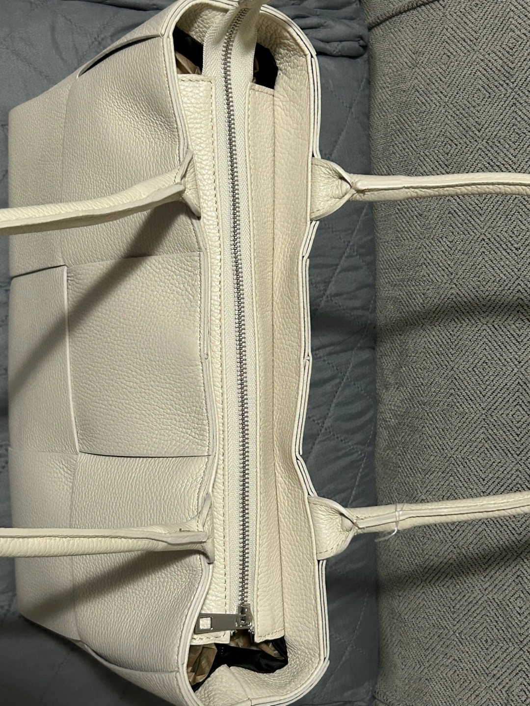 Large off-white leather tote bag. Features a woven design and zipper closure. Two top handles. Interior is lined. Great for everyday use. Made in Italy. Available in different colours.