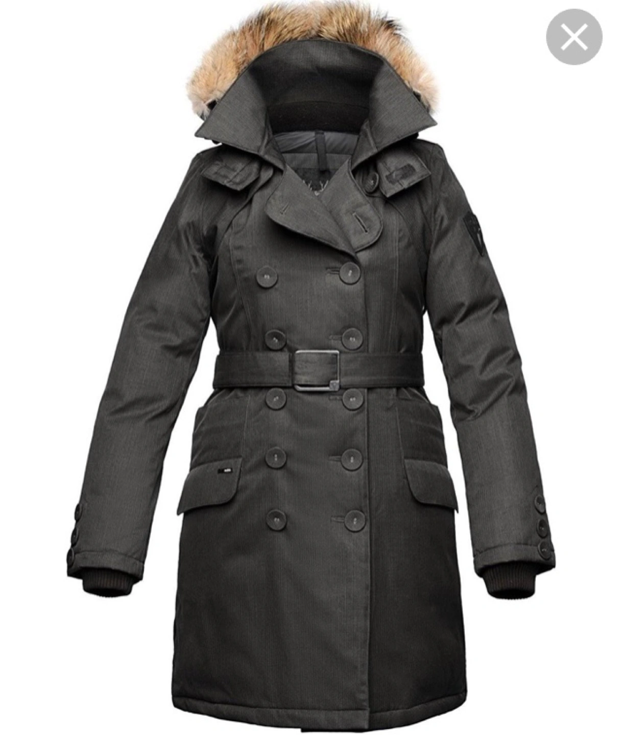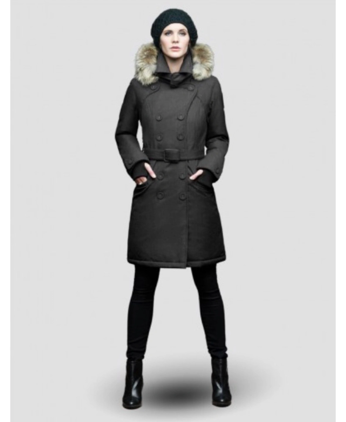 Stylish and warm winter parka. Features a double-breasted design, belted waist
