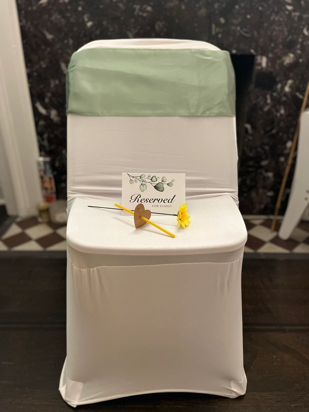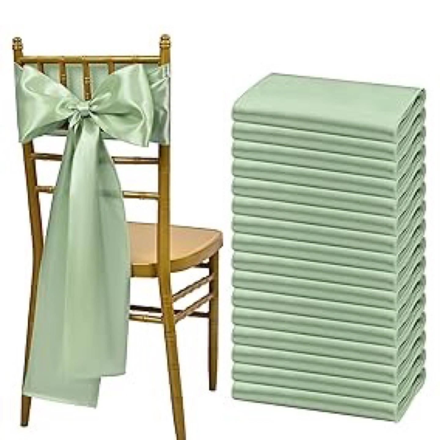 Set of 90+ sage green satin chair sashes. Perfect for weddings or special events. Each sash ties in a bow. Elegant and simple.