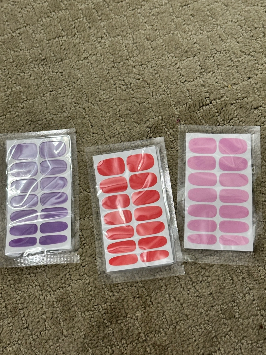 Three packs of nail wraps. Each pack contains twelve individual wraps. Colours include purple, red, and pink.