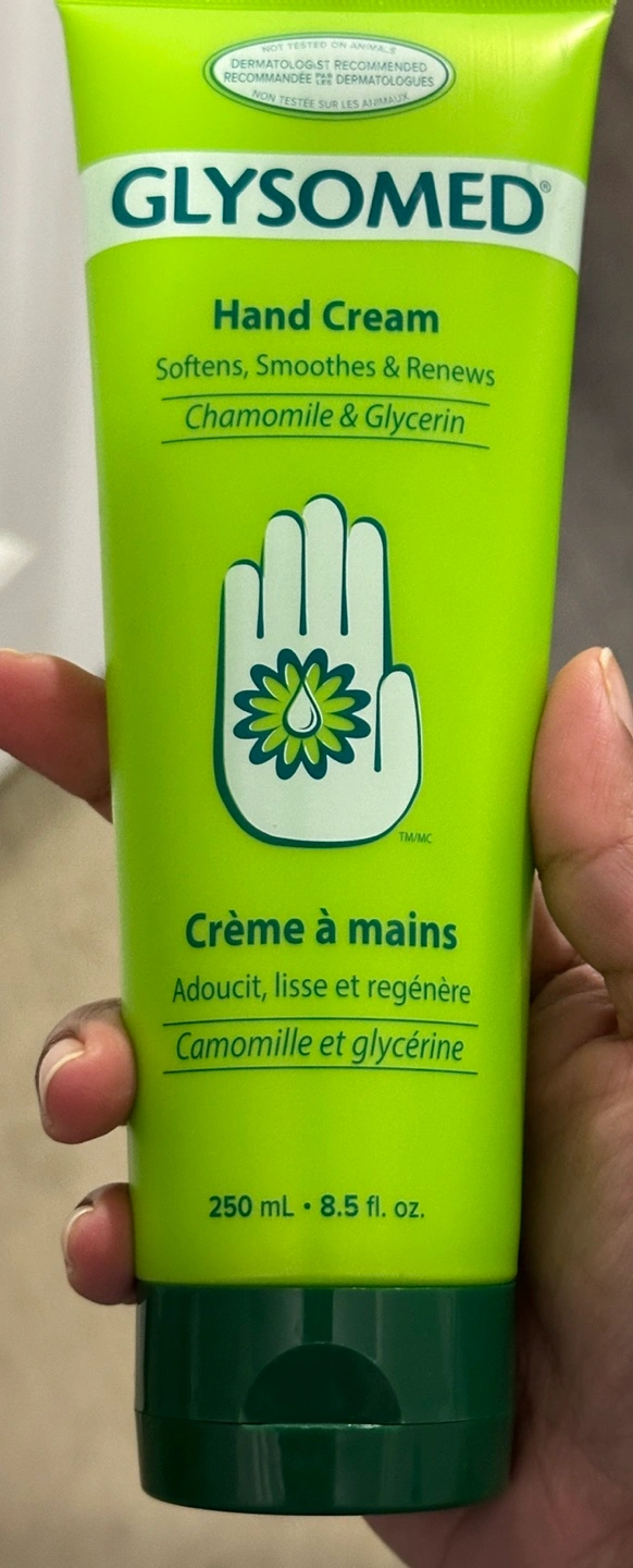 Chamomile and Glycerin hand cream. Softens, smoothes and renews. Dermatologist recommended.