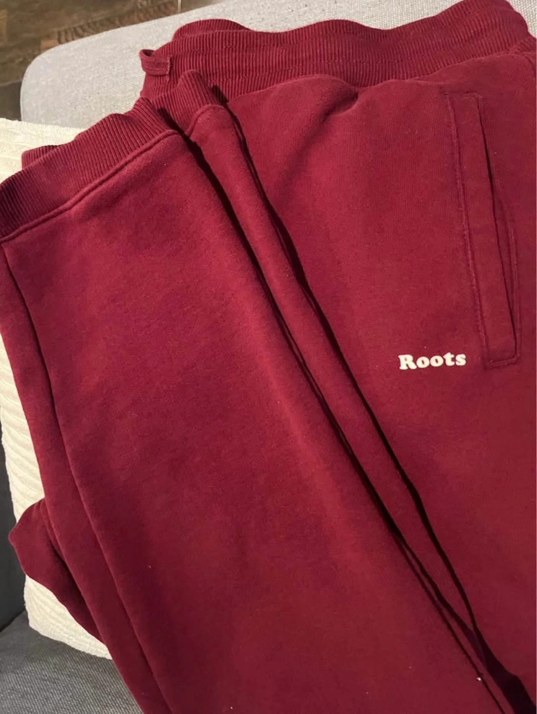 Women's size XL burgundy Roots sweatpants. Elastic waistband with drawstring. Side pockets. Soft and comfortable fabric. Hardly worn. Excellent condition.