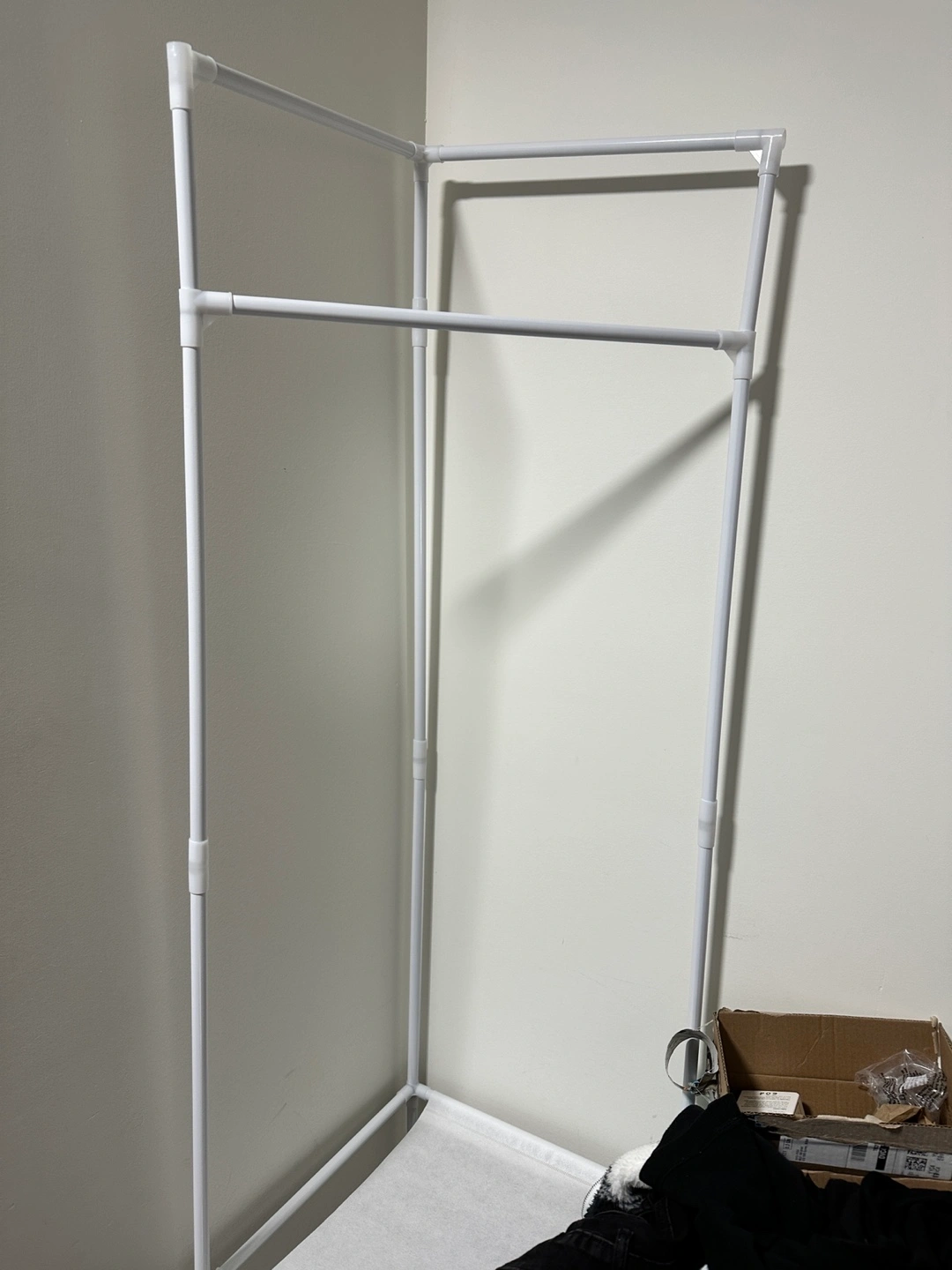 Freestanding garment rack. Two hanging rods. White plastic frame. Simple assembly.