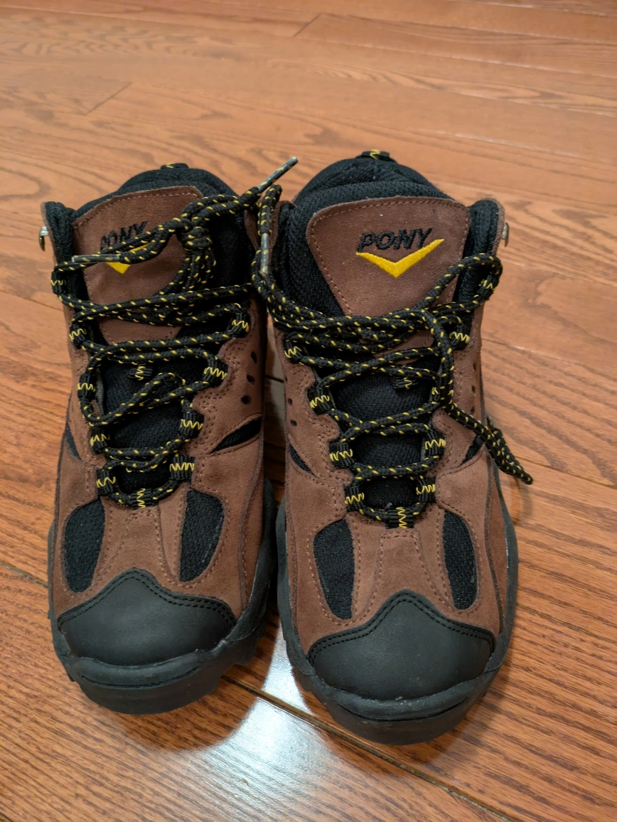 Pair of brown and black Pony hiking boots. Lace-up closure. Good tread.