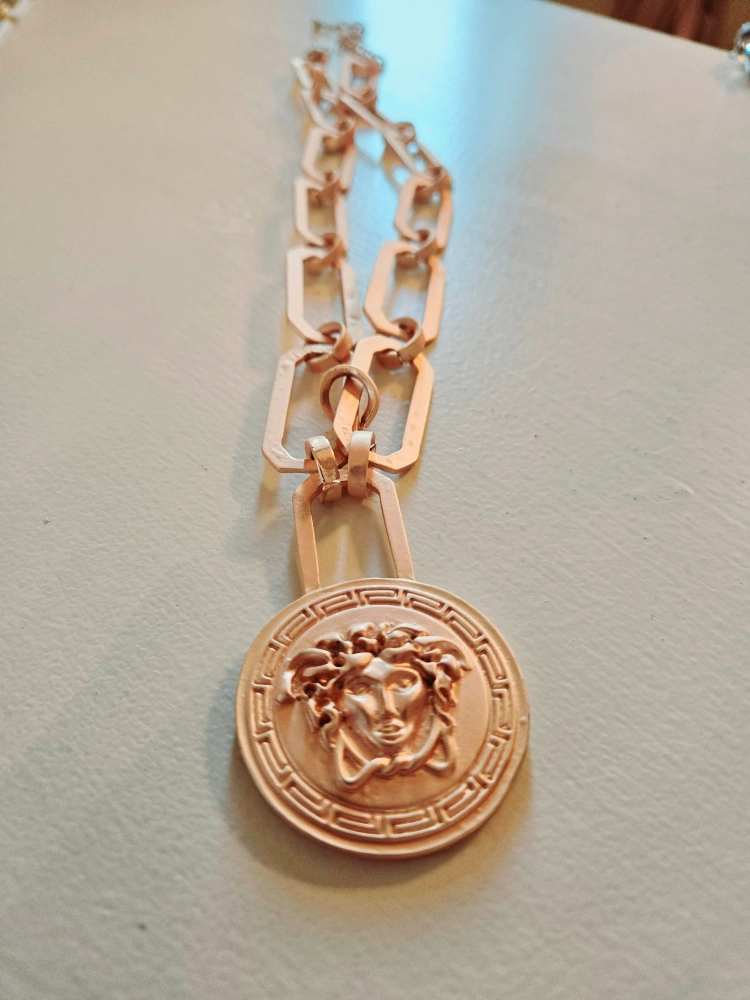 Long gold chain necklace. Features a large circular pendant with a Medusa head design. Elegant statement piece.