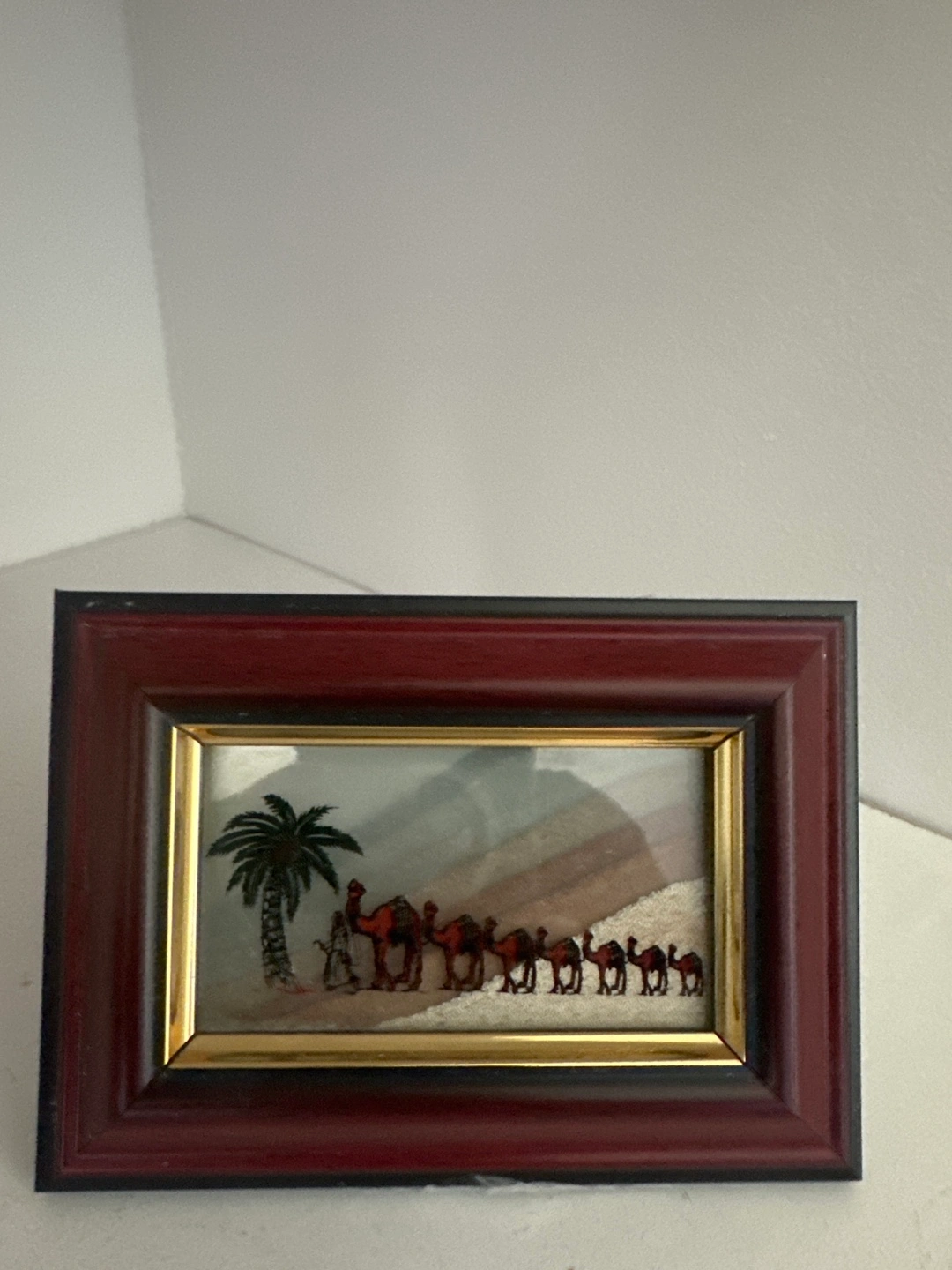 Unique sand art picture. Depicts a caravan of camels travelling through a desert landscape. Features a palm tree. Handmade in the U.A.E. Small picture frame, perfect for a shelf or desk.