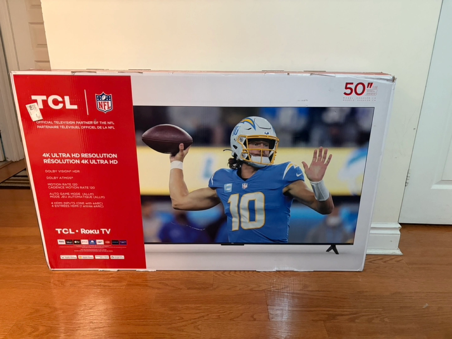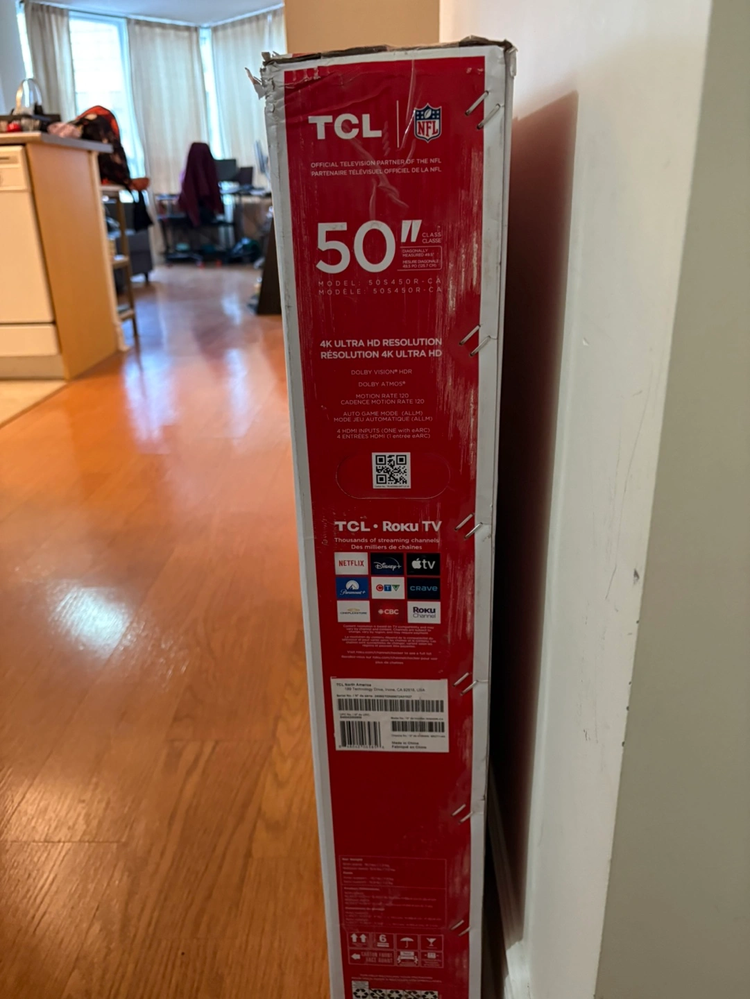 50-inch screen, 4K Ultra HD resolution. Dolby Vision HDR. Includes Roku TV with access to popular streaming apps. New, unopened box. Pick up only. Here’s a link for reference: https://www.tcl.com/ca/en/products/home-theater/s4-class/50-class-4k-uhd-hdr-led-smart-roku-tv-50s450r-ca