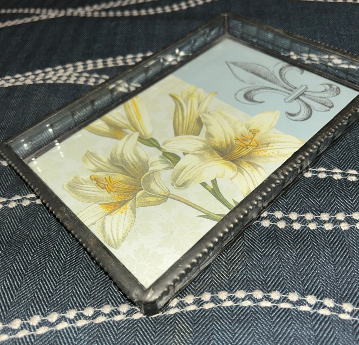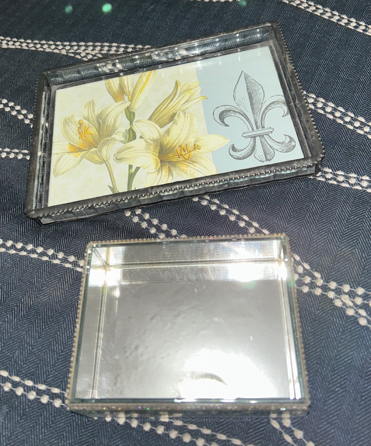 Two beautiful glass jewelry holders pretty enough to display on your dresser and keep your precious trinkets contained elegantly!. Small one features a mirrored interior and rimmed in rhinestones 4.5 x 3.5”. Large one has a floral print and fleur-de-lis; felt backed. 8 x 5.5”. Both are in excellent condition. No cracks or chips. Take both for $12.
