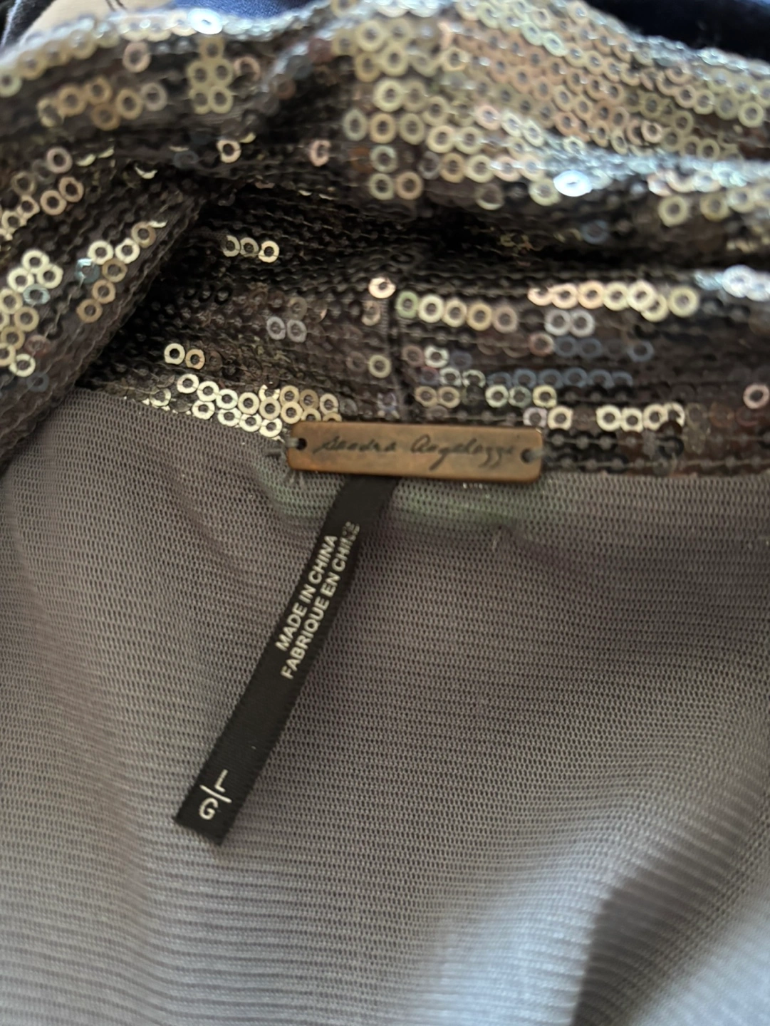 Gorgeous dark grey sequin top. Features a draped, wrap-style design. Sleeveless with sheer panel inserts. Perfect for a night out.