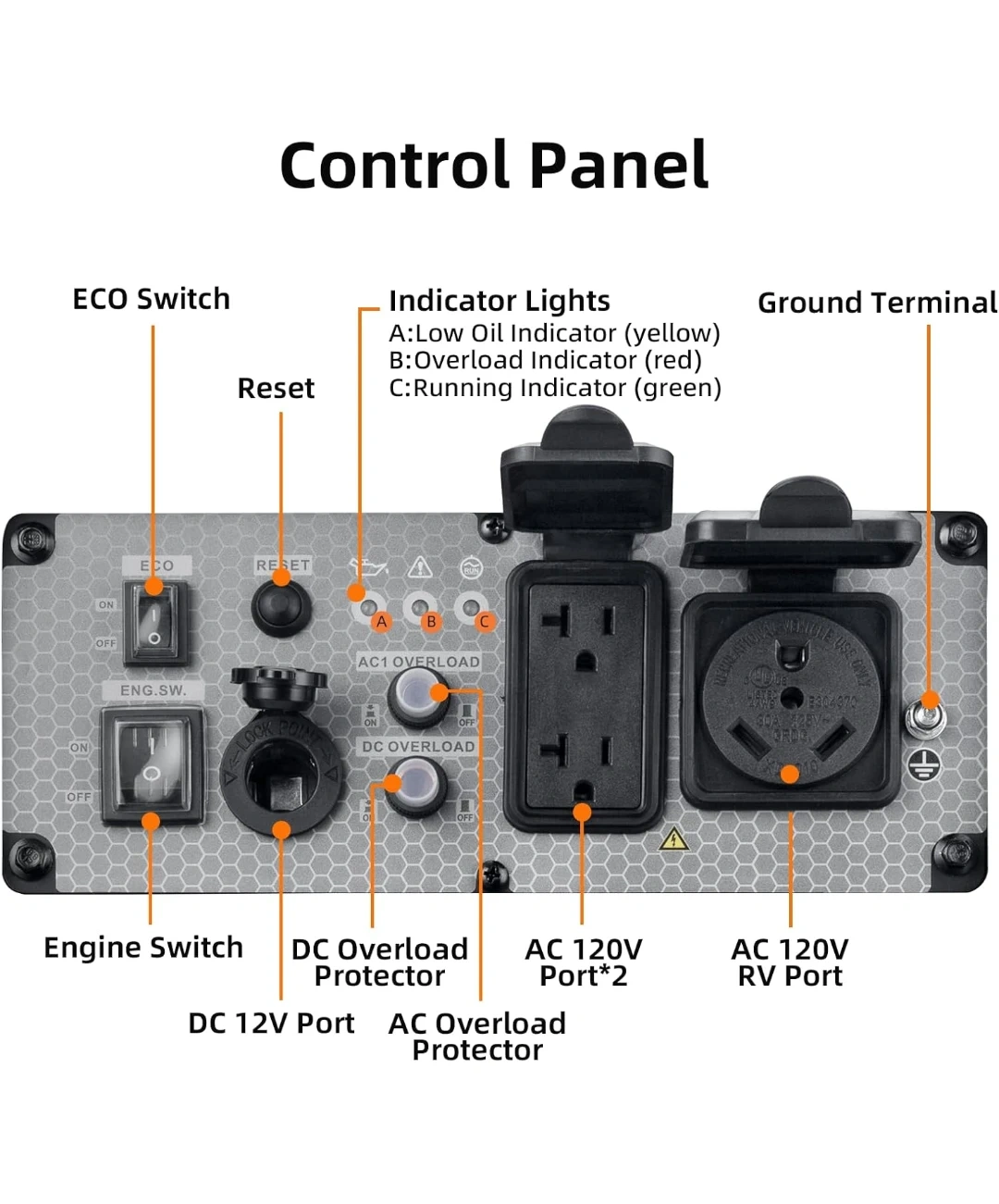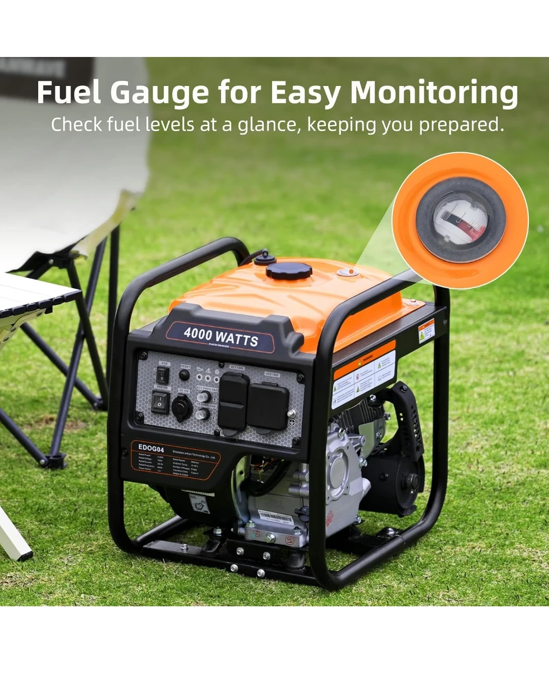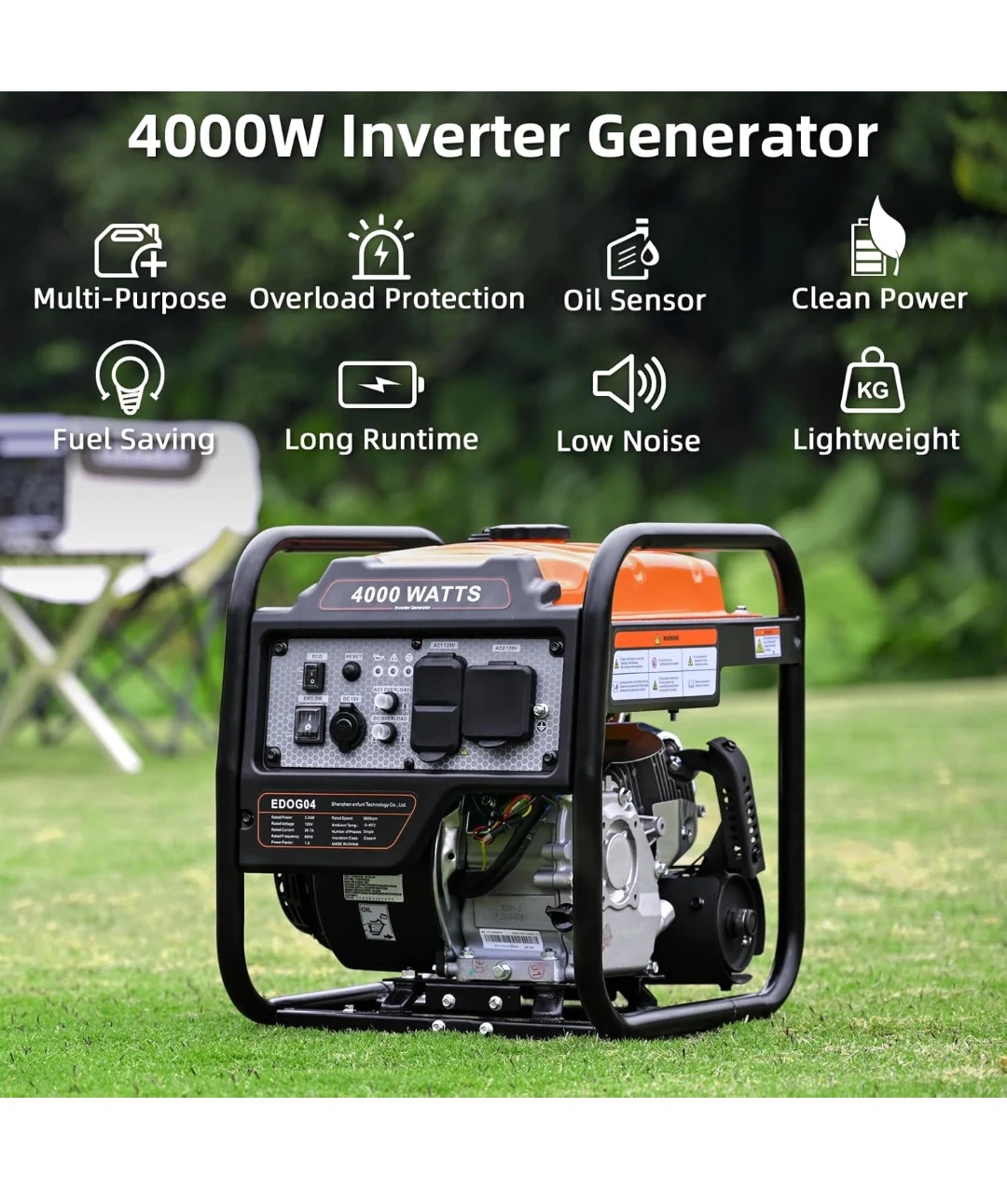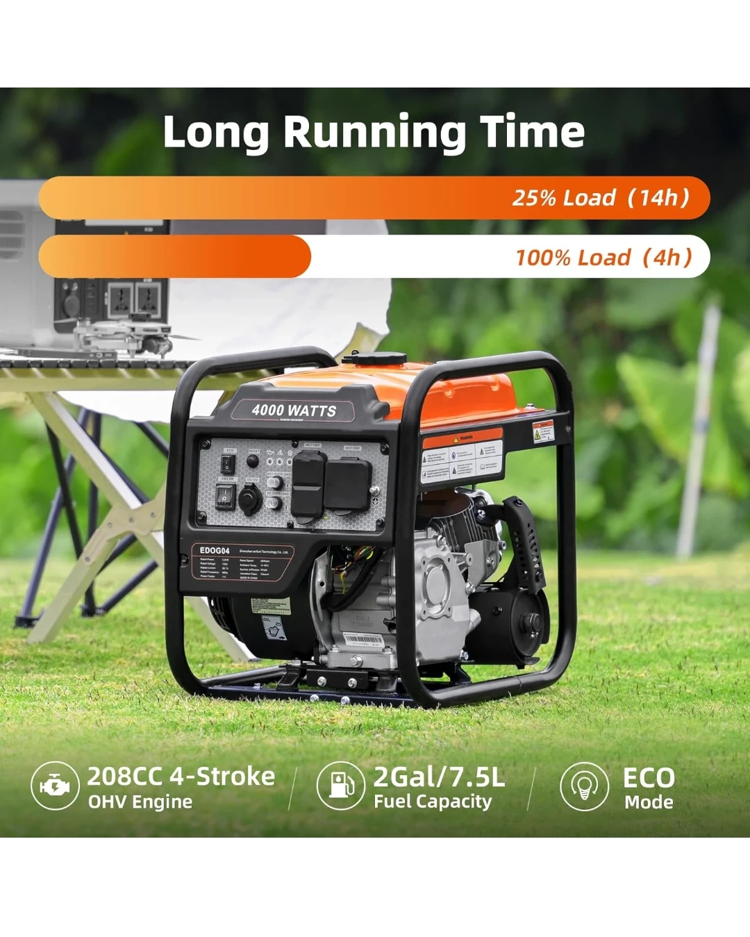 This 4000W inverter generator features a 208CC 4-stroke OHV engine and a 2gal/7.5L fuel capacity. It has an ECO mode for fuel saving and long runtime. Includes overload protection and an oil sensor.