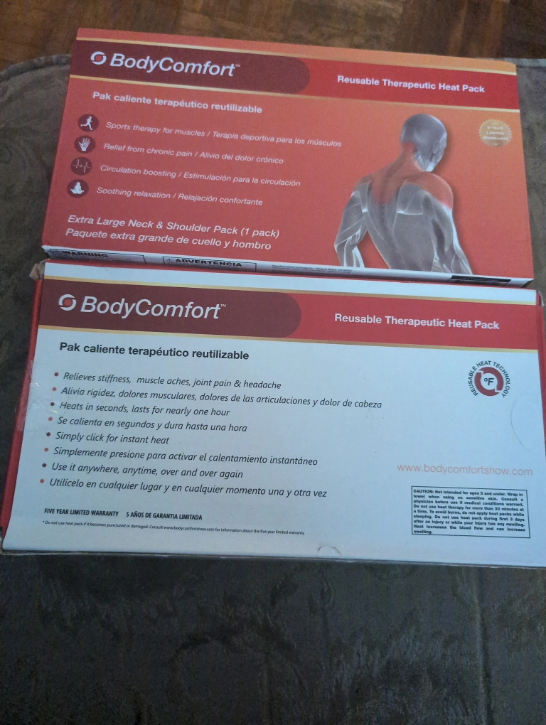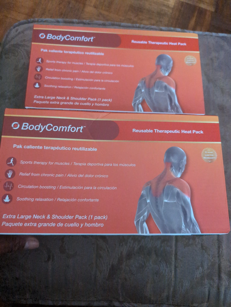 Extra large neck and shoulder packs. Reusable heat therapy. Provides soothing relaxation and relief from chronic pain. Great for muscle aches and headaches. Five-year limited warranty.