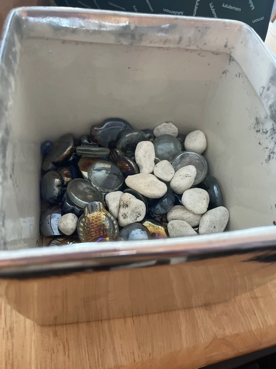 Silver square planter filled with decorative glass stones. Great for home decor. Adds a touch of elegance to any space.