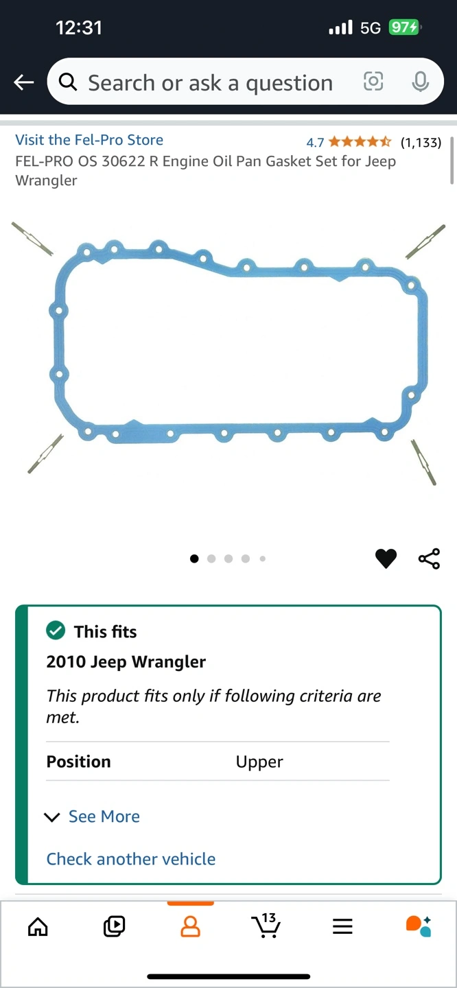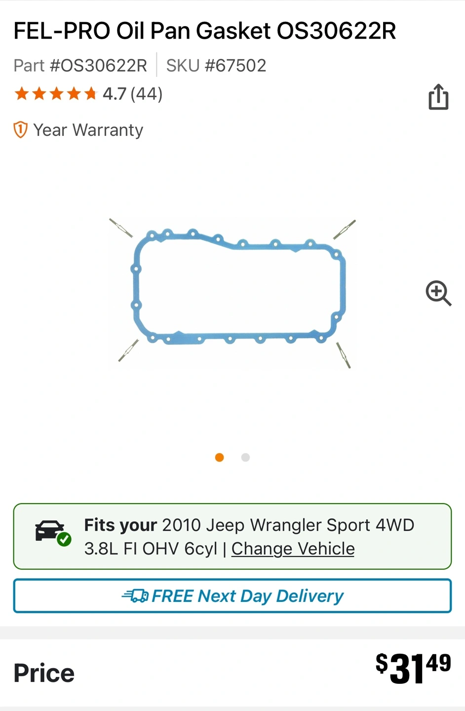 New Fel-Pro oil pan gasket in original box. Upper position. PermaDry Blue molded rubber. Includes Snap-Ups. Fits 2010 Jeep Wrangler JK 6cyl and many other models, please see photos for lists. Bought and sold vehicle before rebuild, no longer need. Pickup UWS