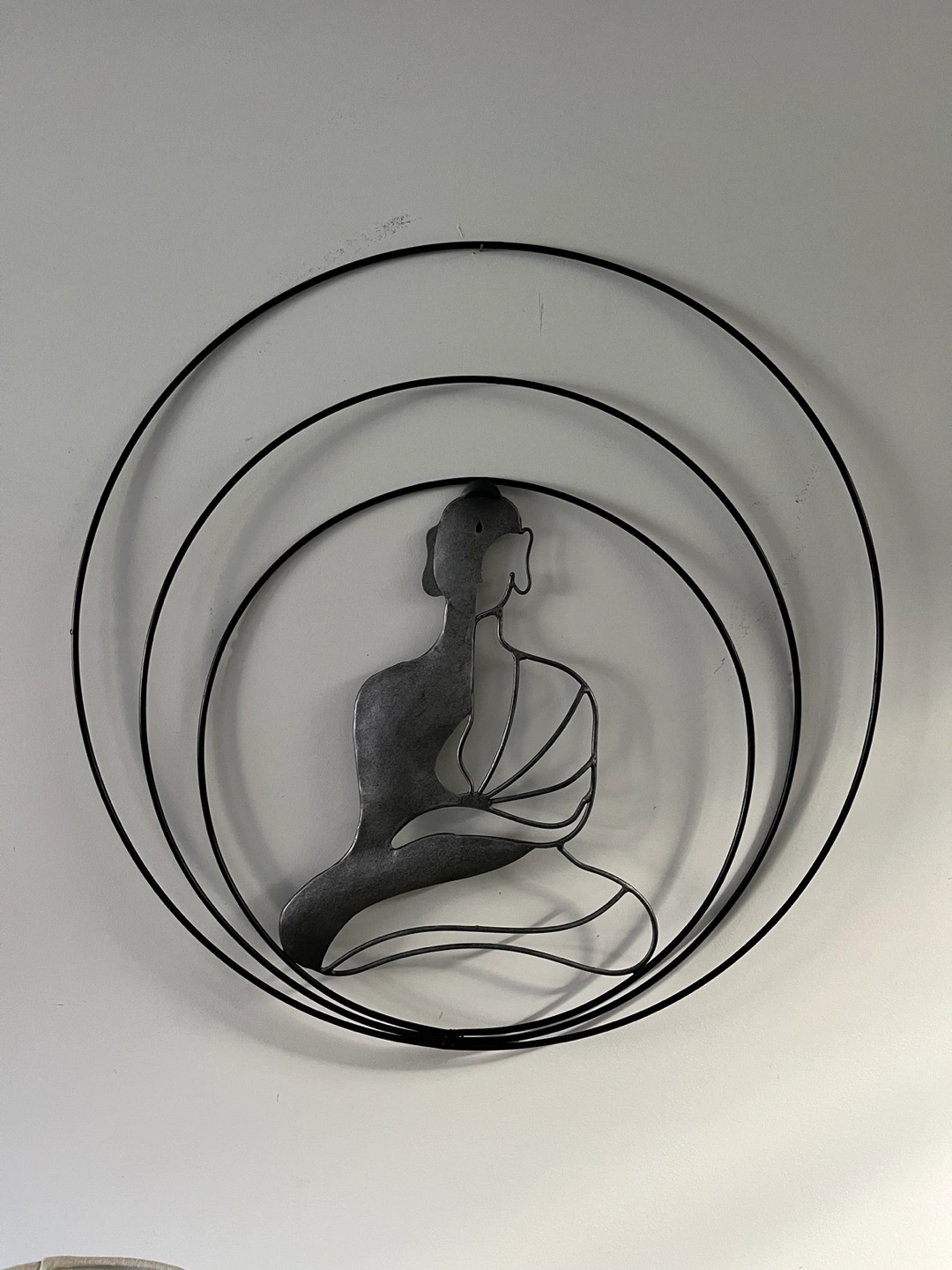 Beautiful metal wall art. Features a serene Buddha figure within concentric circles. Gunmetal grey finish. Adds a touch of zen to any space.