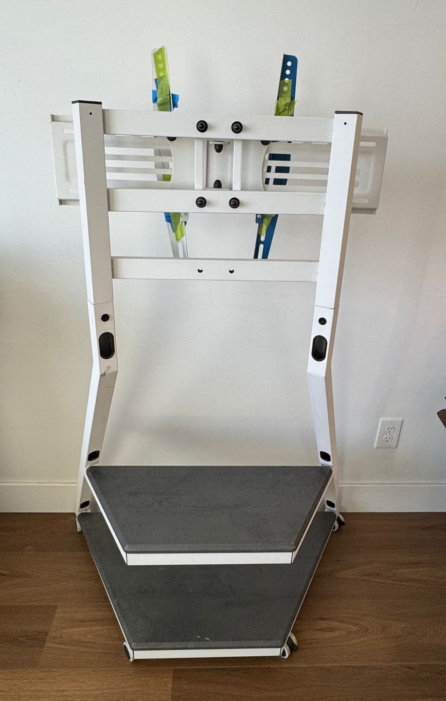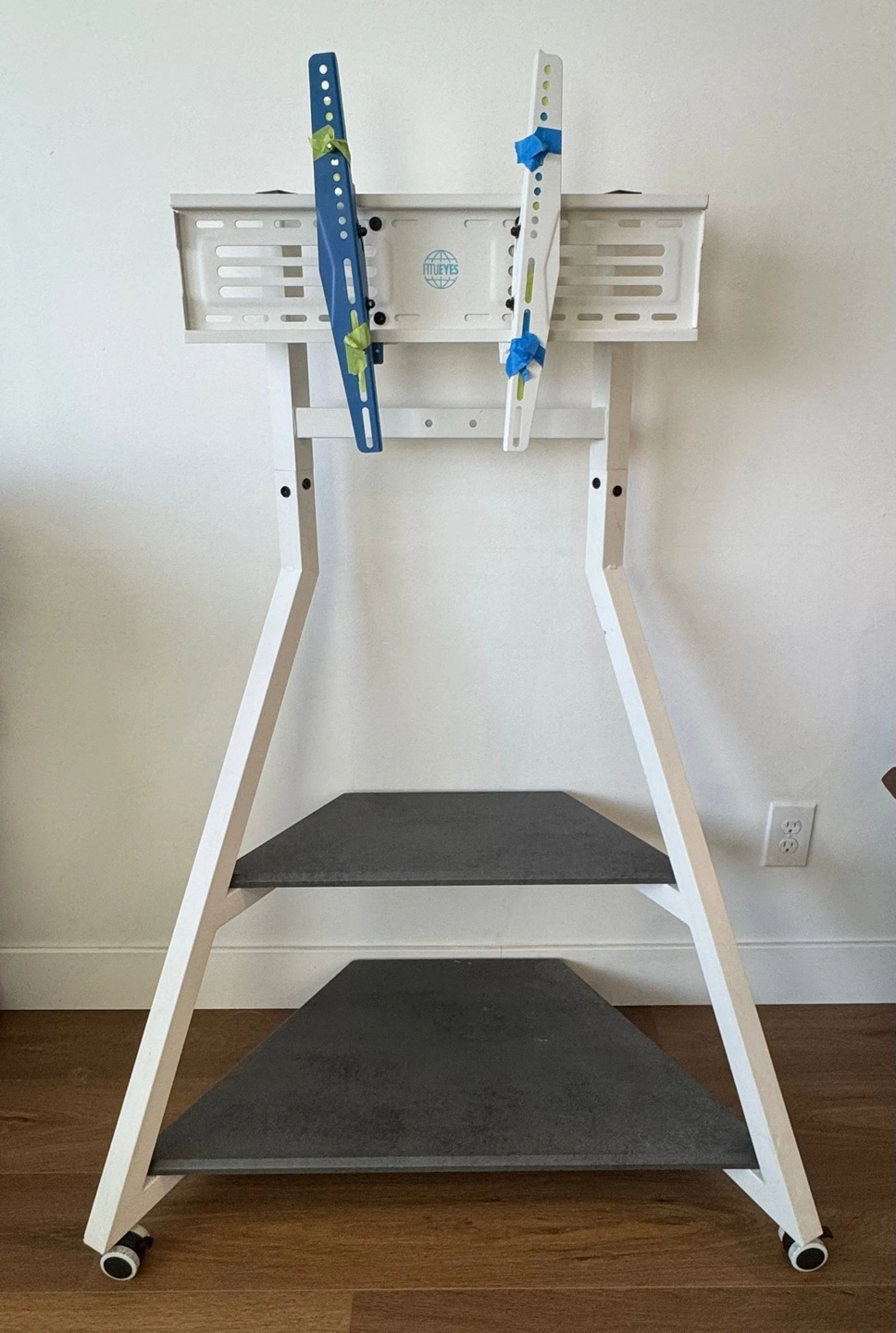 Modern floor stand. Swivel tilt adjustable. Wire management. Two shelves. White. With wheels (very secure wheel locks)