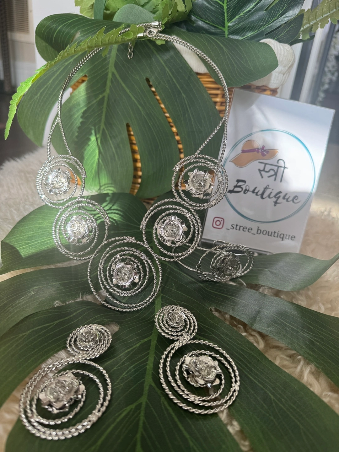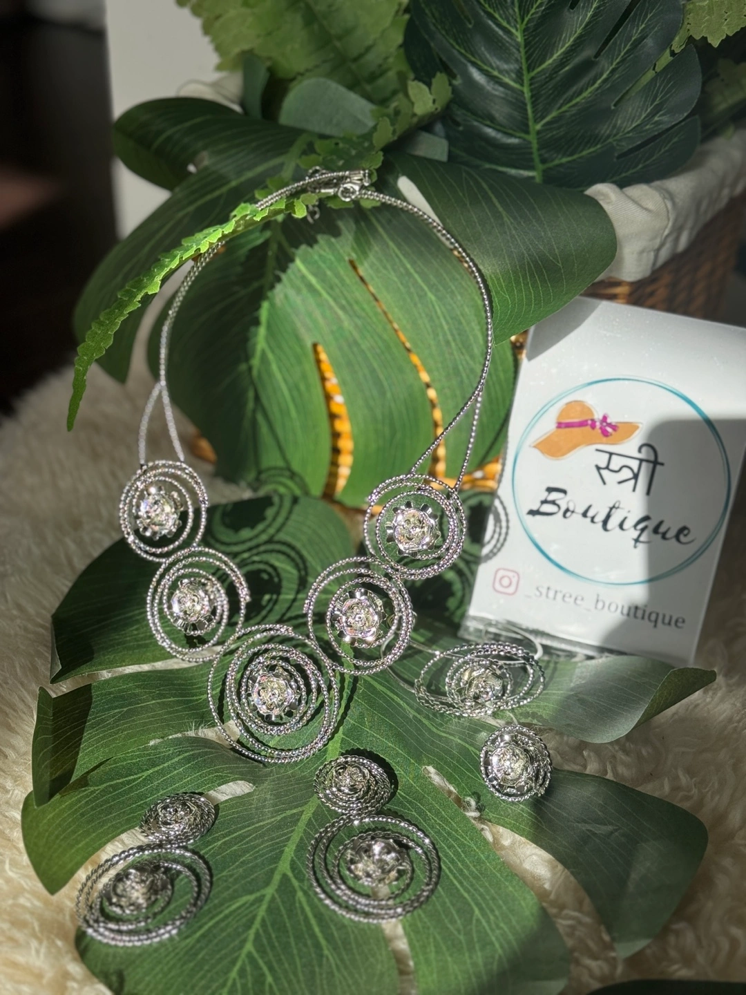 75Gorgeous silver necklace and earring set. Features sparkly embellishments. Perfect for a special occasion. Elegant and eye-catching.