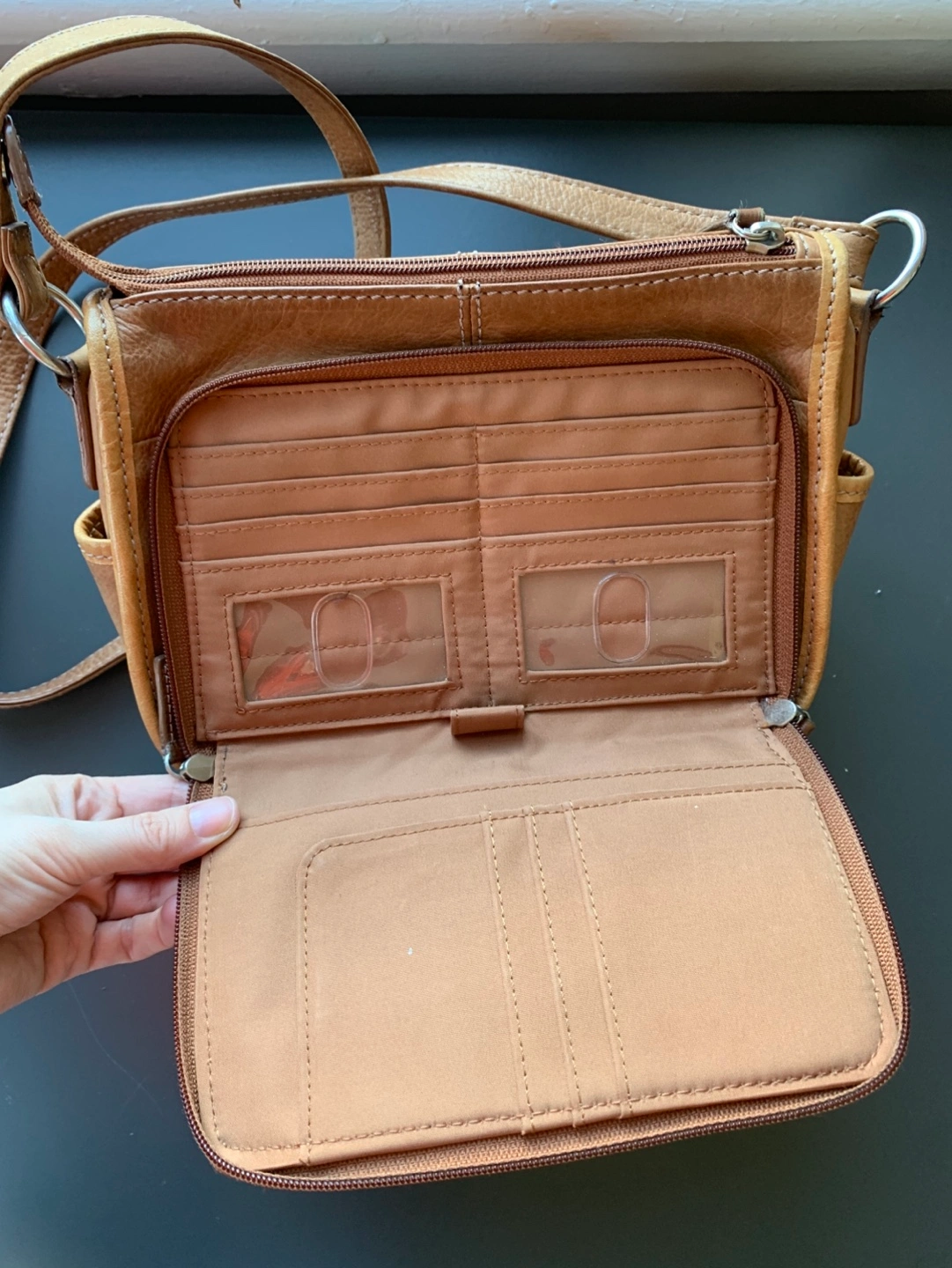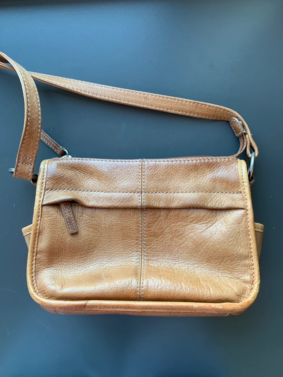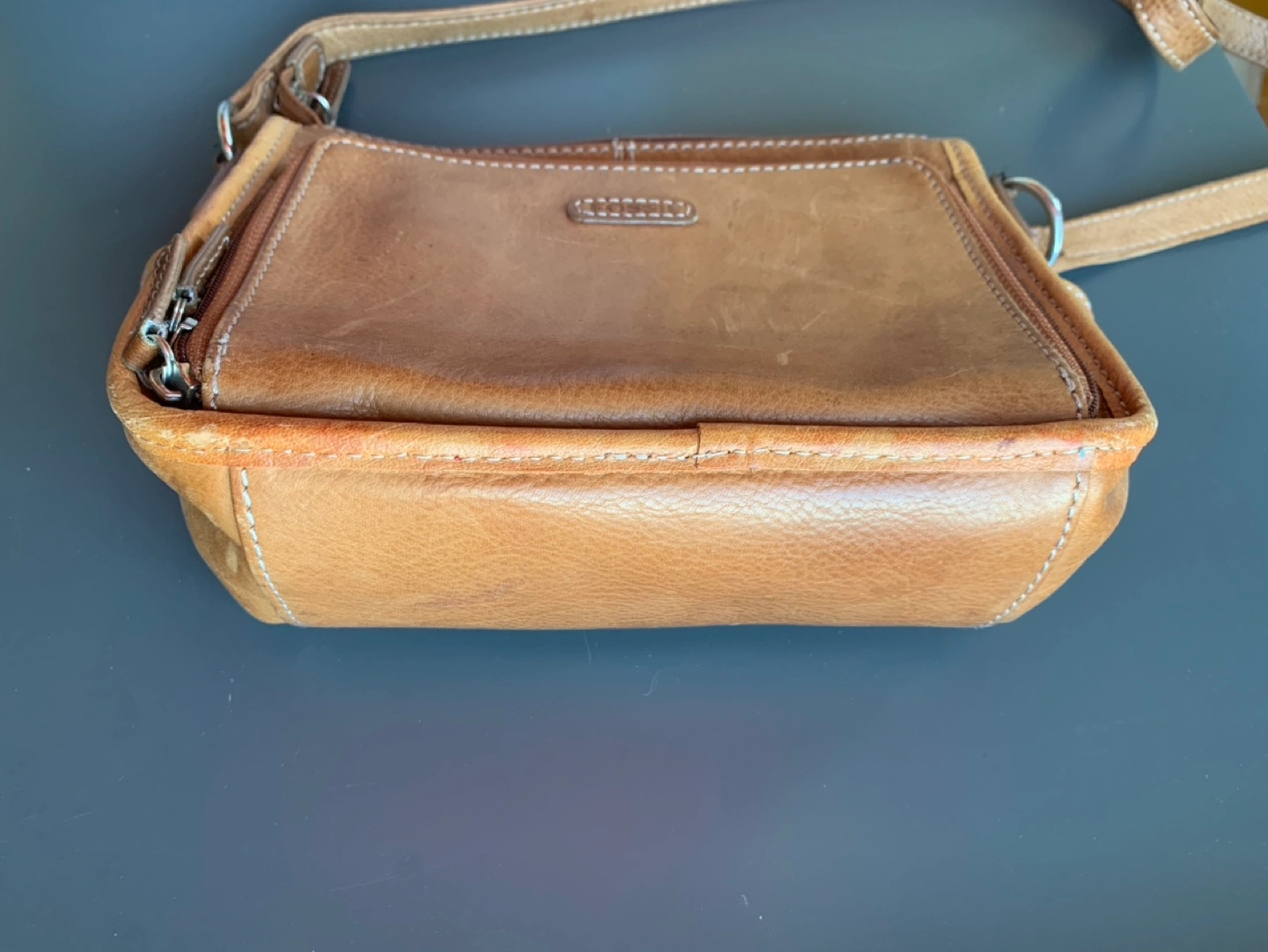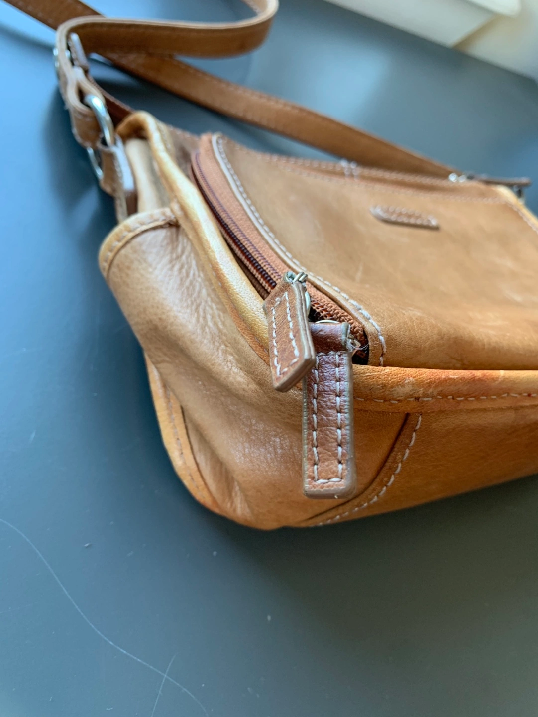 Light brown leather crossbody bag. Multiple zippered compartments.