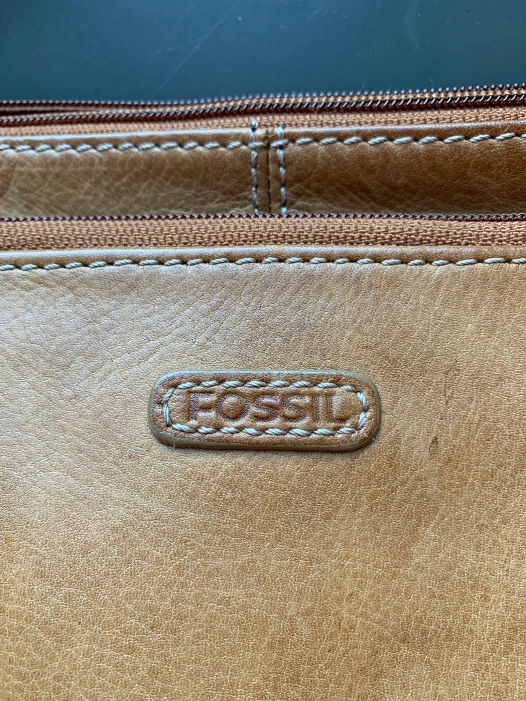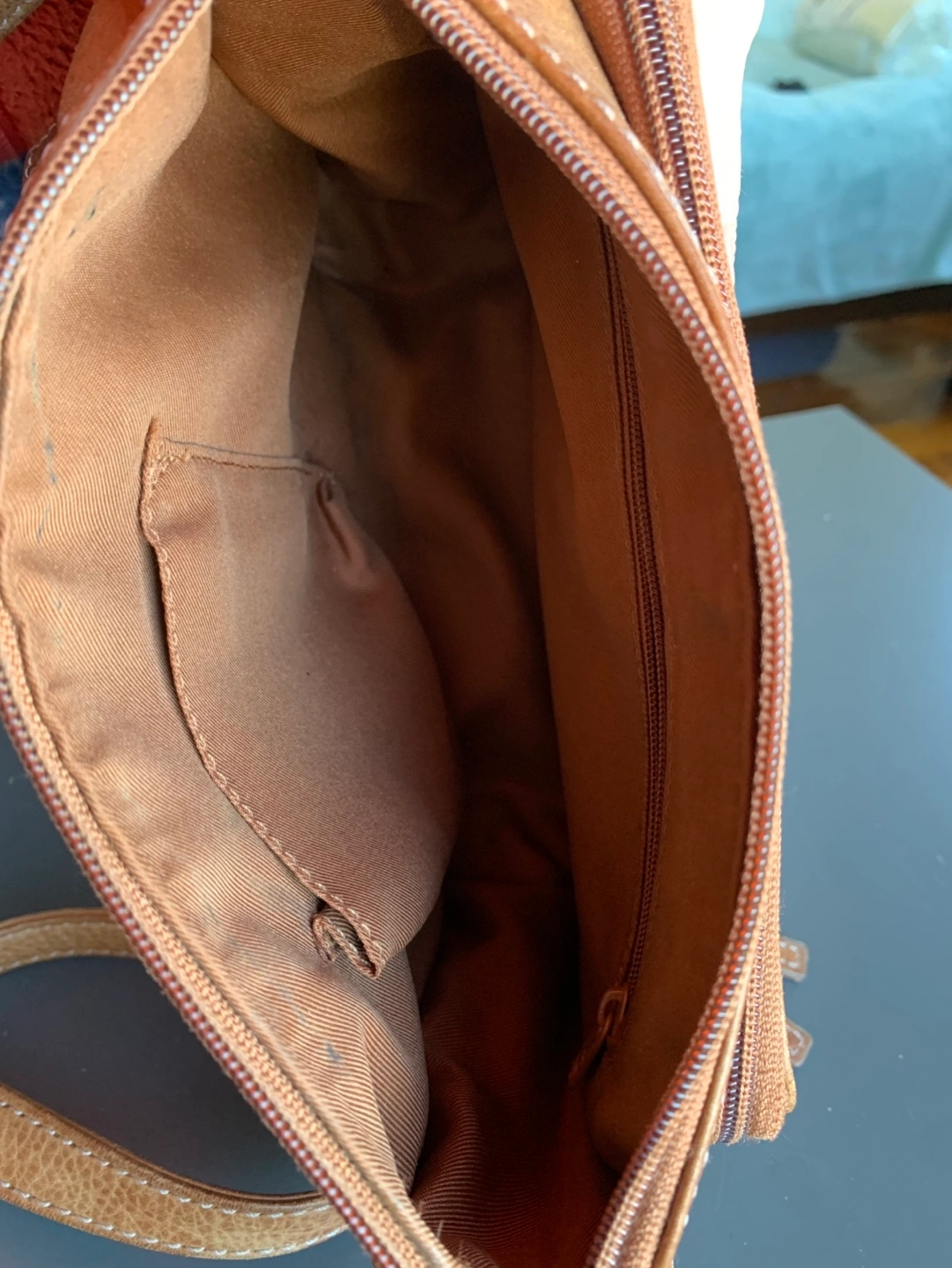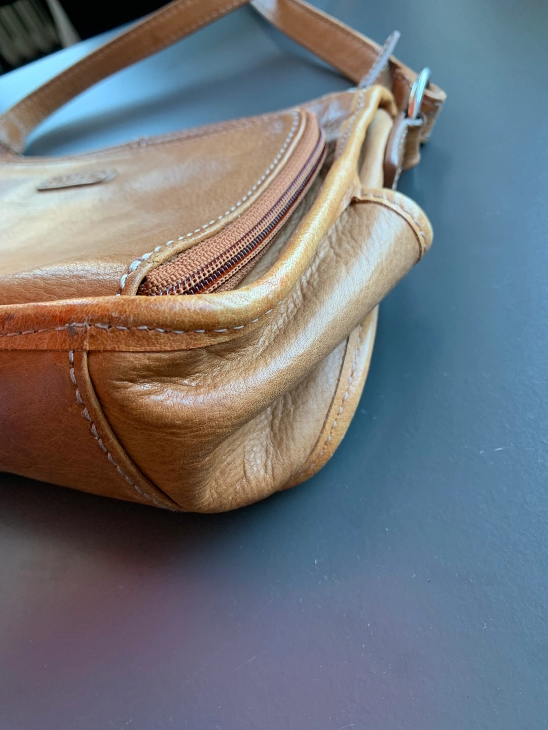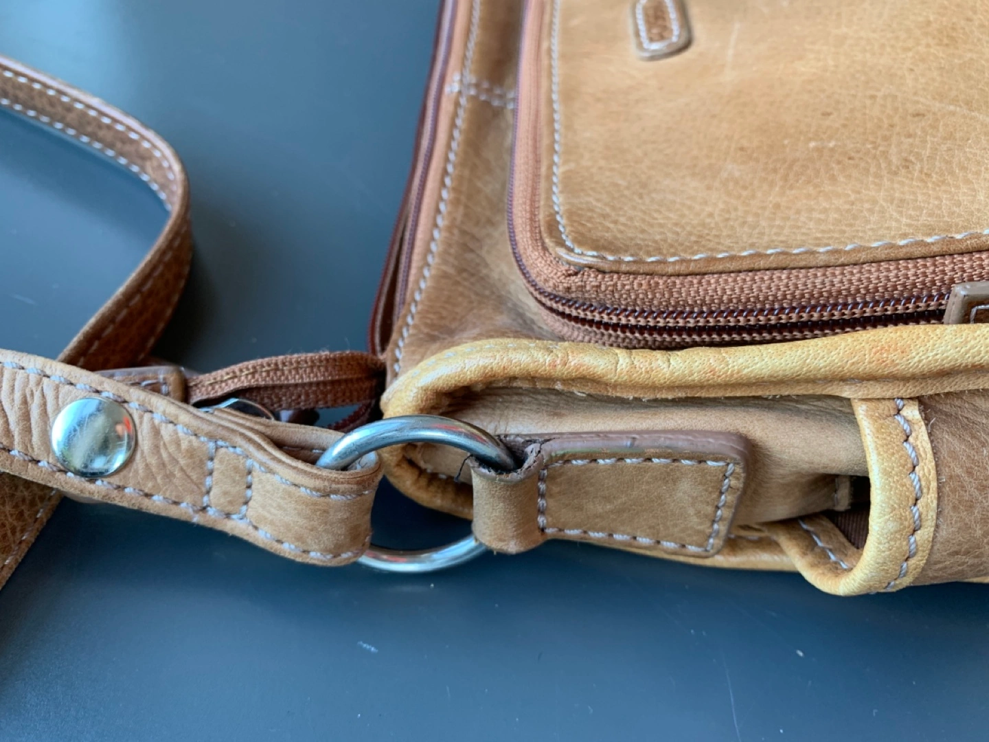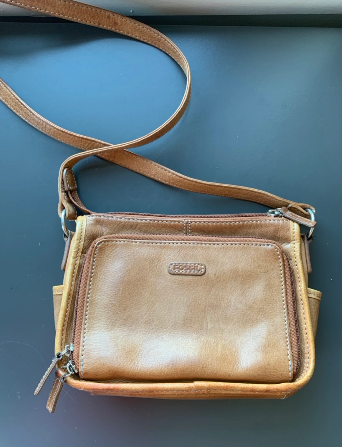 Light brown leather crossbody bag. Multiple zippered compartments.