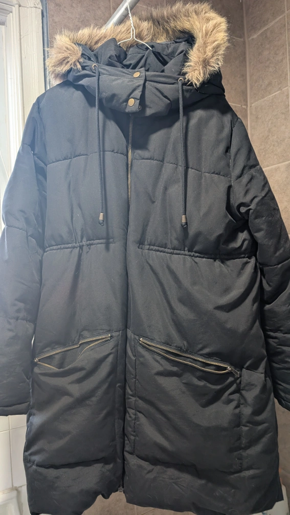 Long hooded puffer coat. Features faux fur trim. Maternity style. Black. Old Navy Frost Free maternity winter jacket Pickup only St Clair East and O'Connor