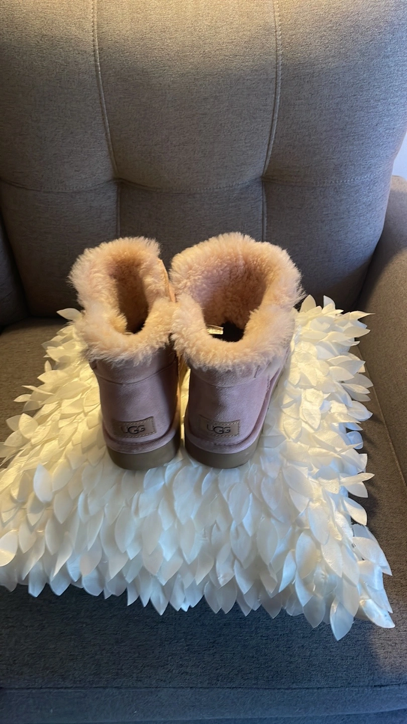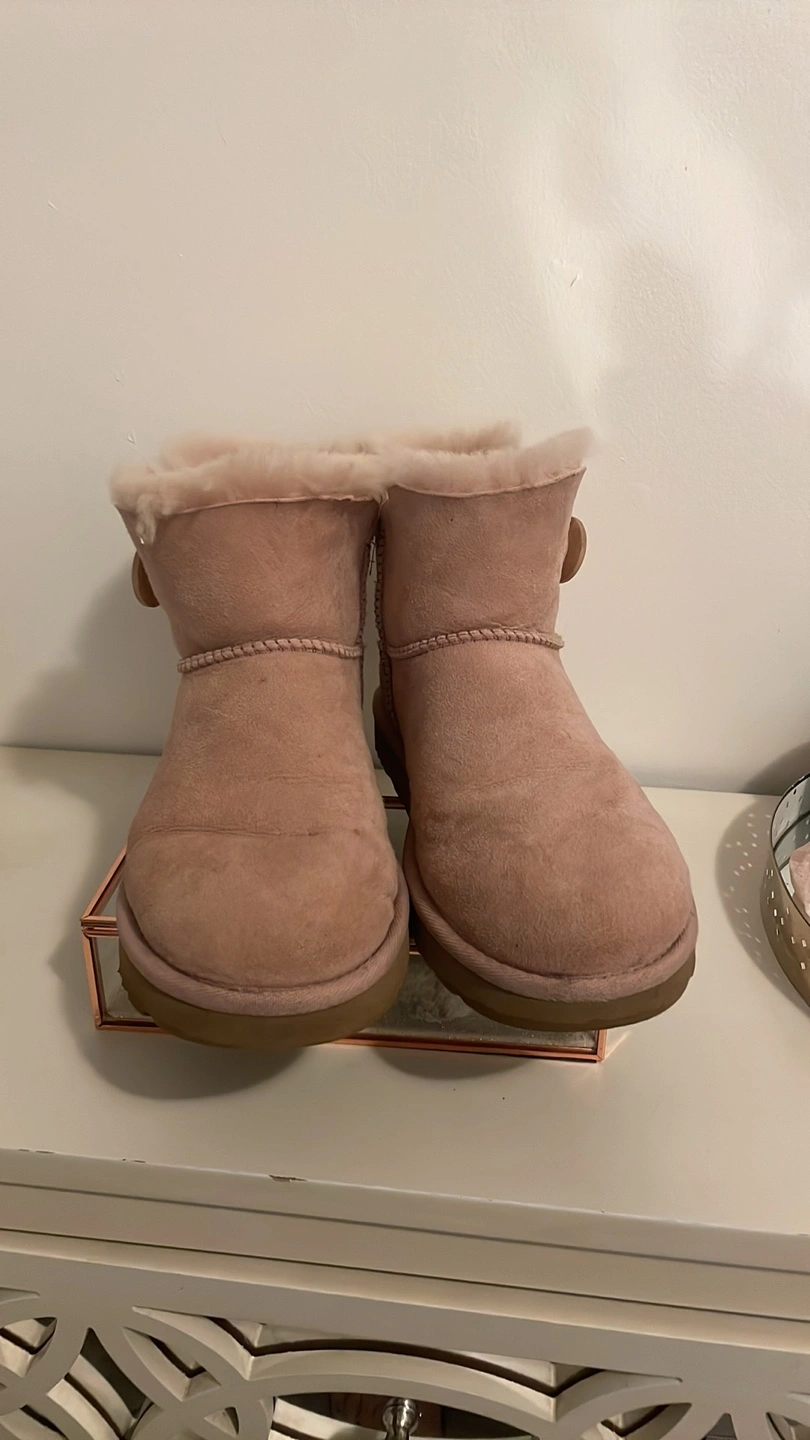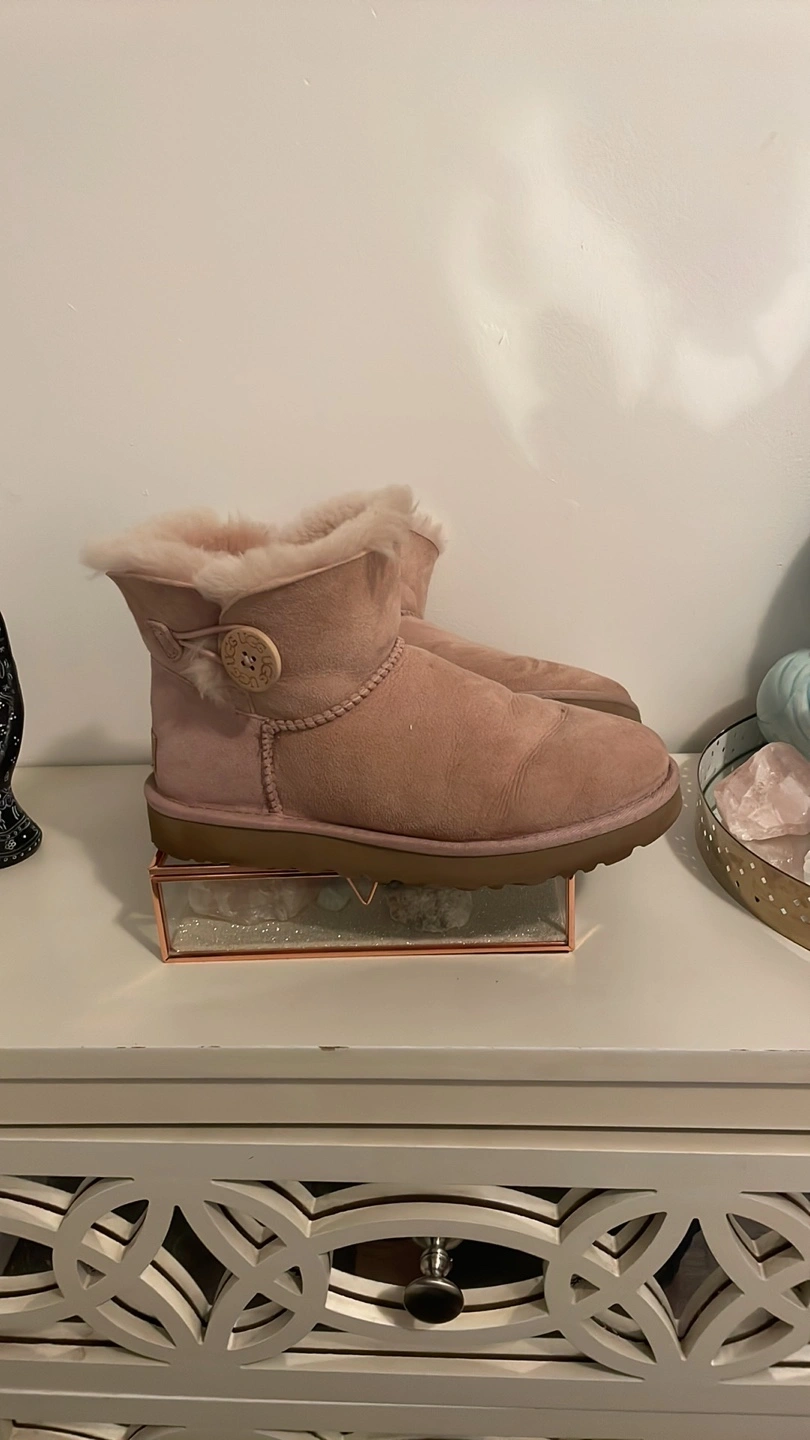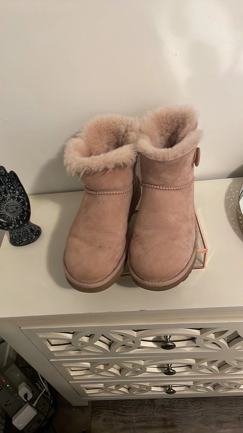 Women's UGG Mini Bailey Button boots. Blush pink suede. Classic UGG style. Sheepskin lining. Excellent condition.