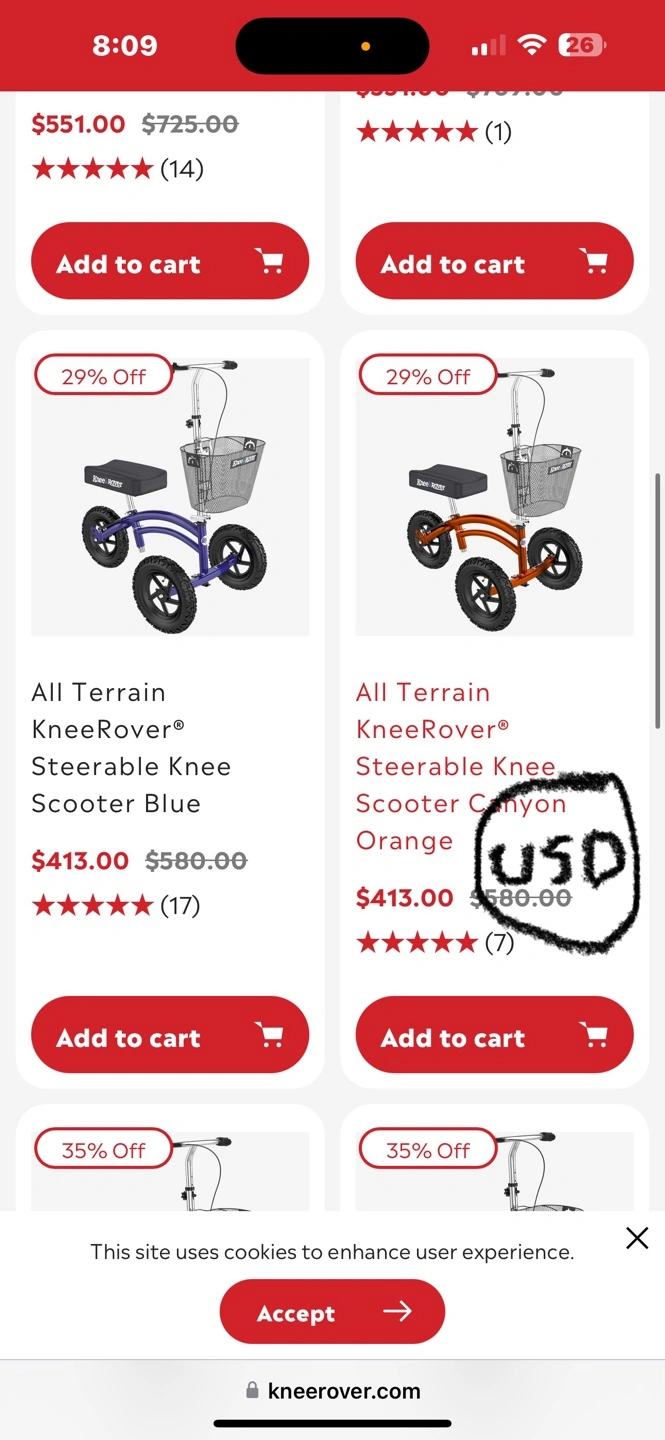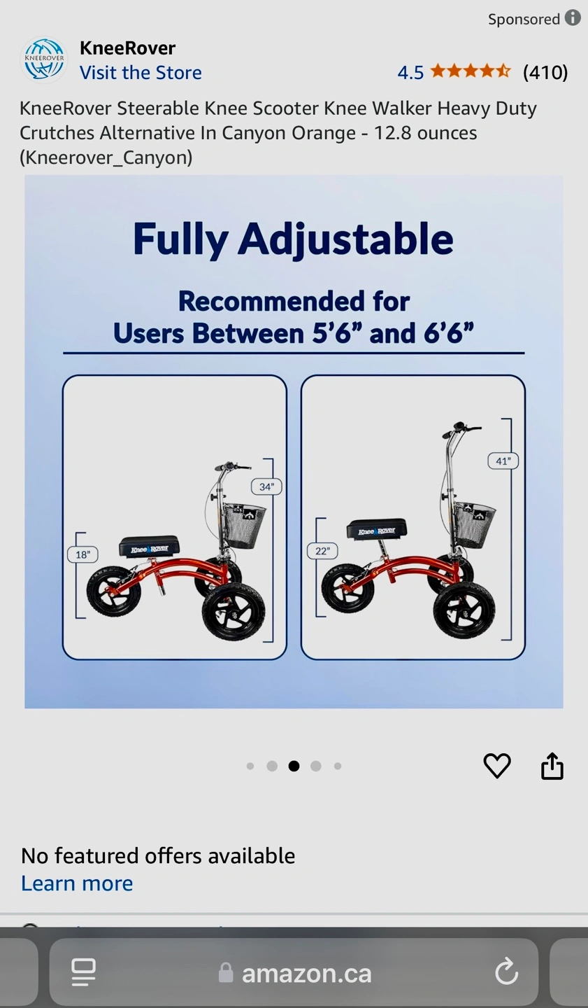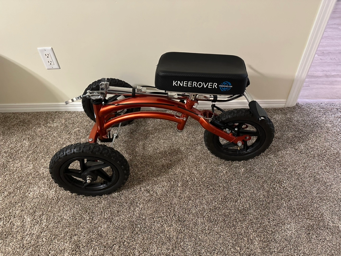 All-terrain knee scooter. Features three wheels, padded seat, and storage basket. Canyon orange colour. Adjustable height. It’s an awesome alternative to crutches. I was so glad to have it. Useful for healing from a broken foot, or ankle break/sprain.