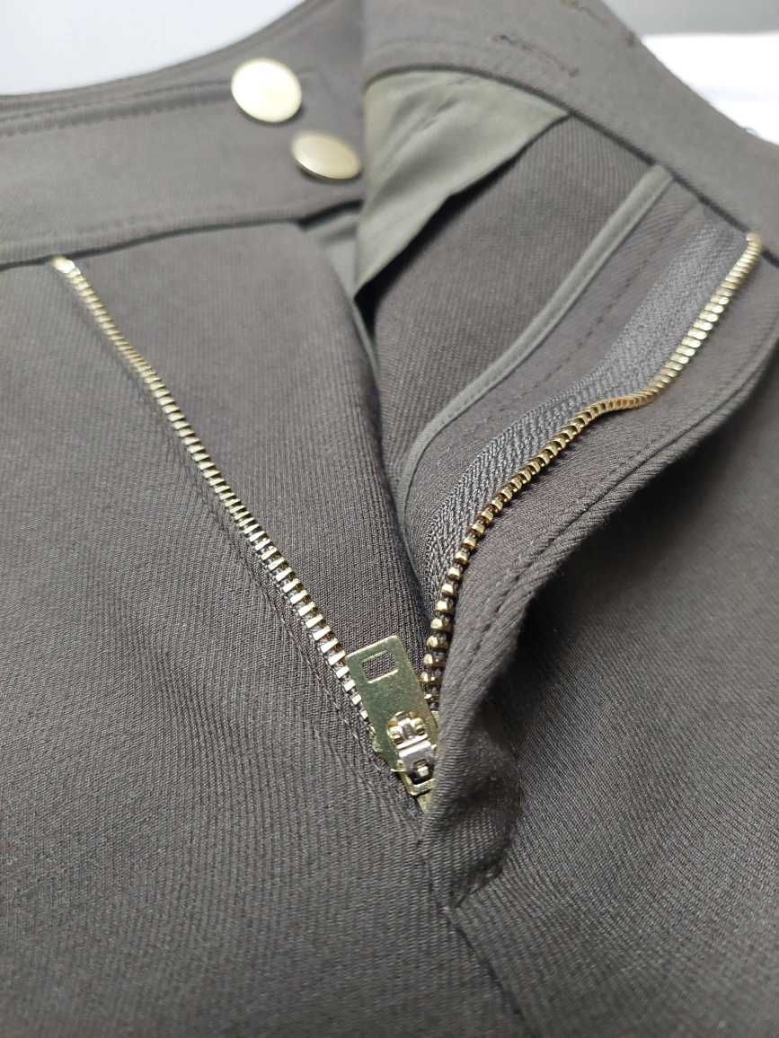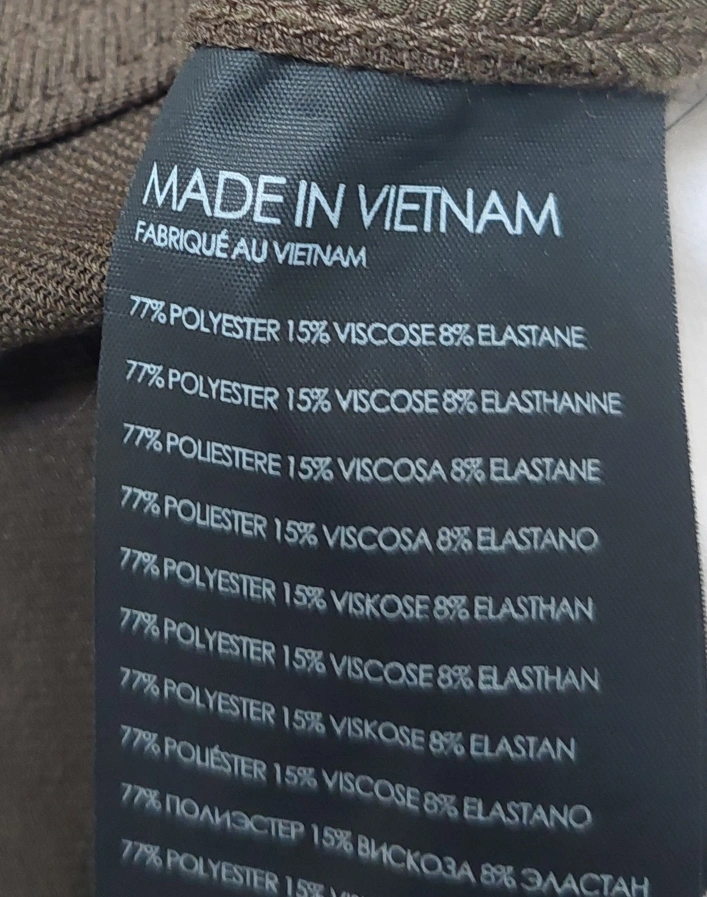 Zipèper and button closure. Four pockets. Made in Vietnam. 77% polyester, 15% viscose, 8% elastane.