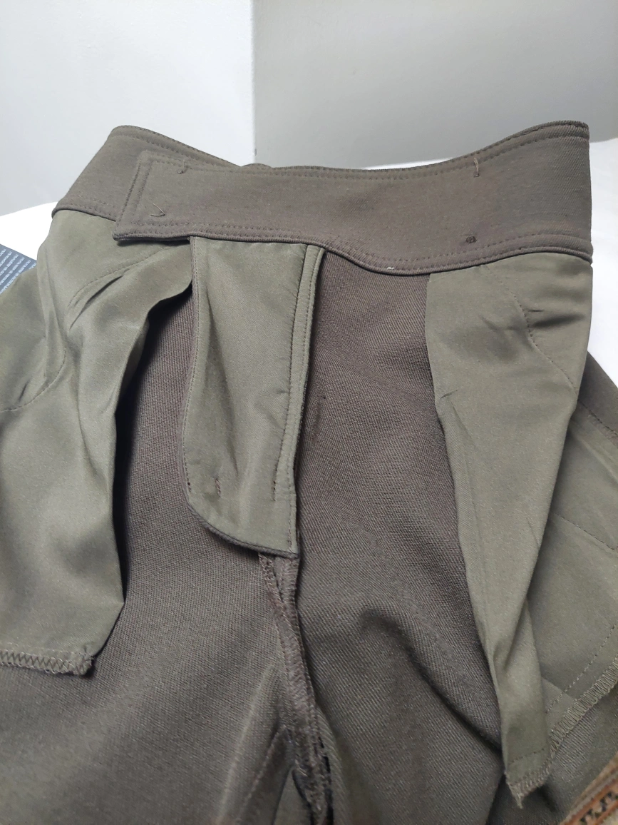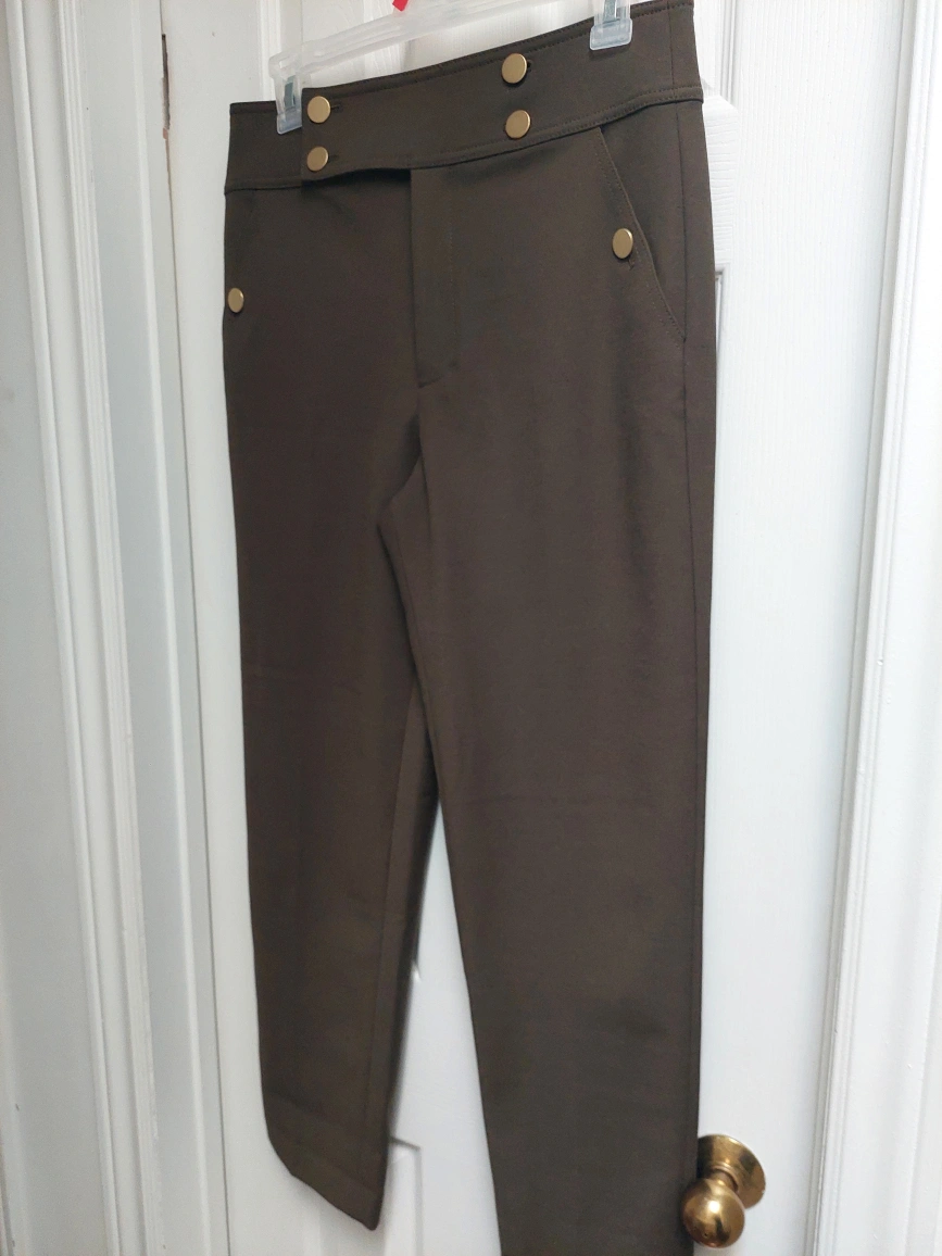 Olive green women's pants with wide waist band. Detailing 6 golden buttons.