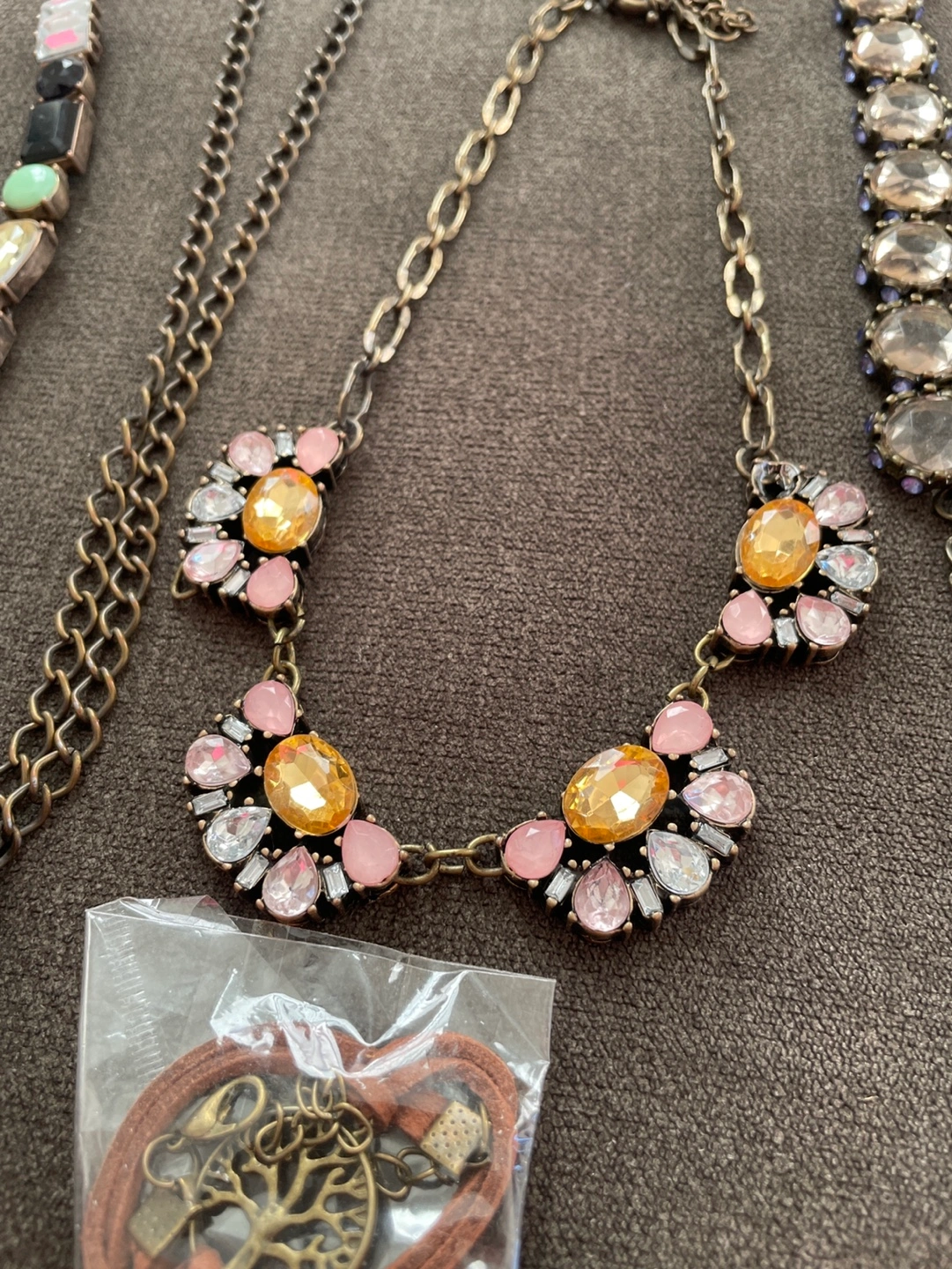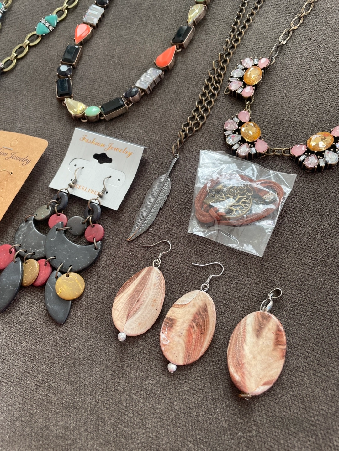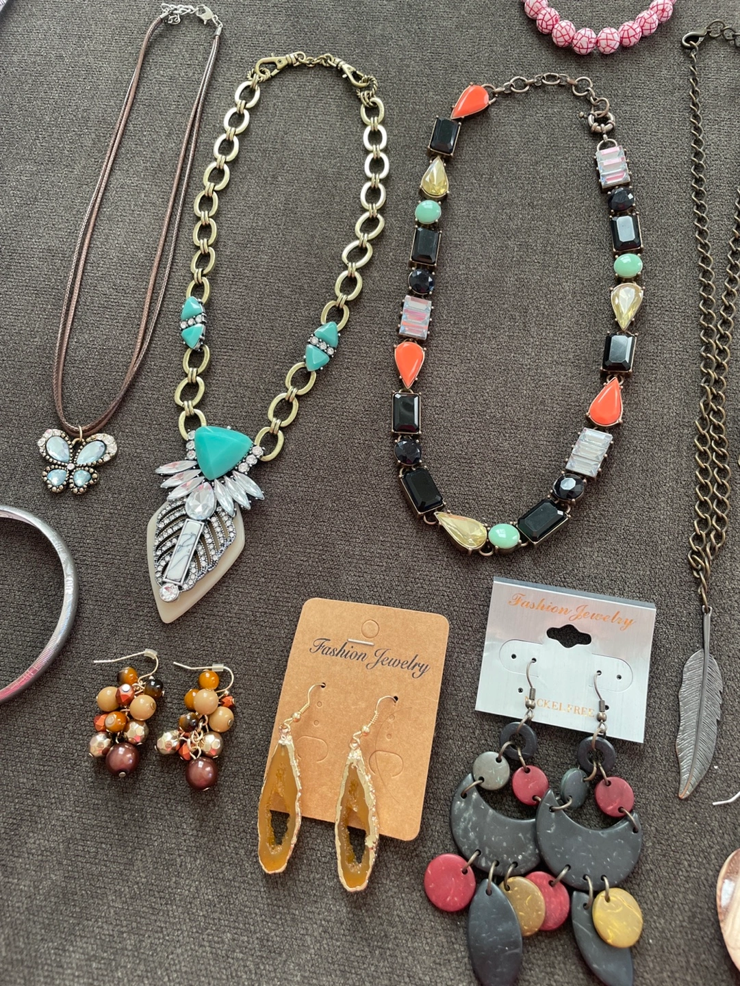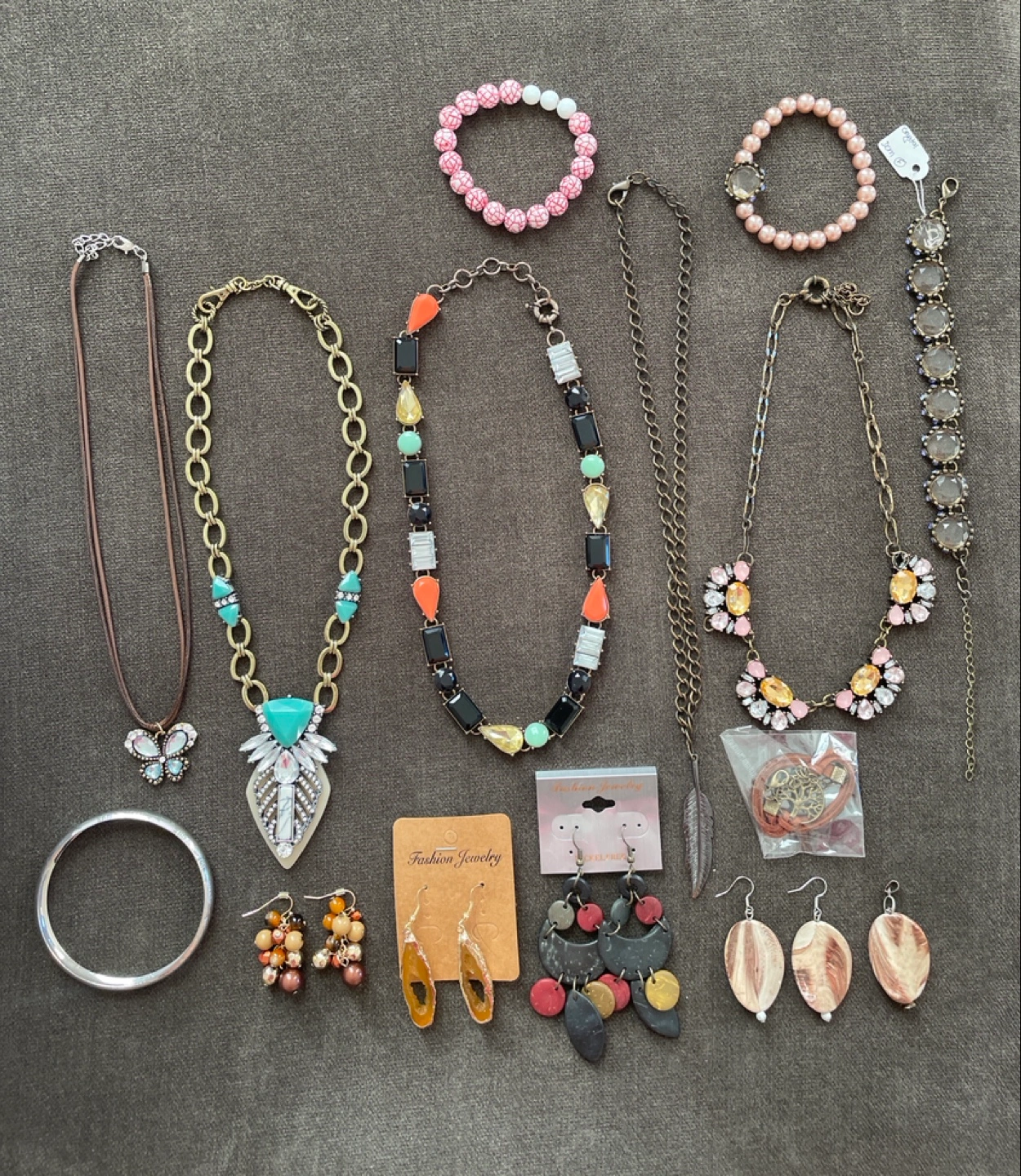 Large collection of women's fashion jewelry. Includes various necklaces, bracelets, and earrings. Mix of styles and colours. Great for personal use or resale.