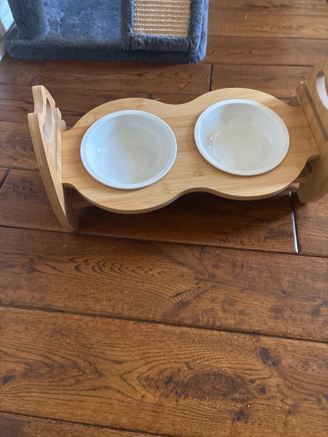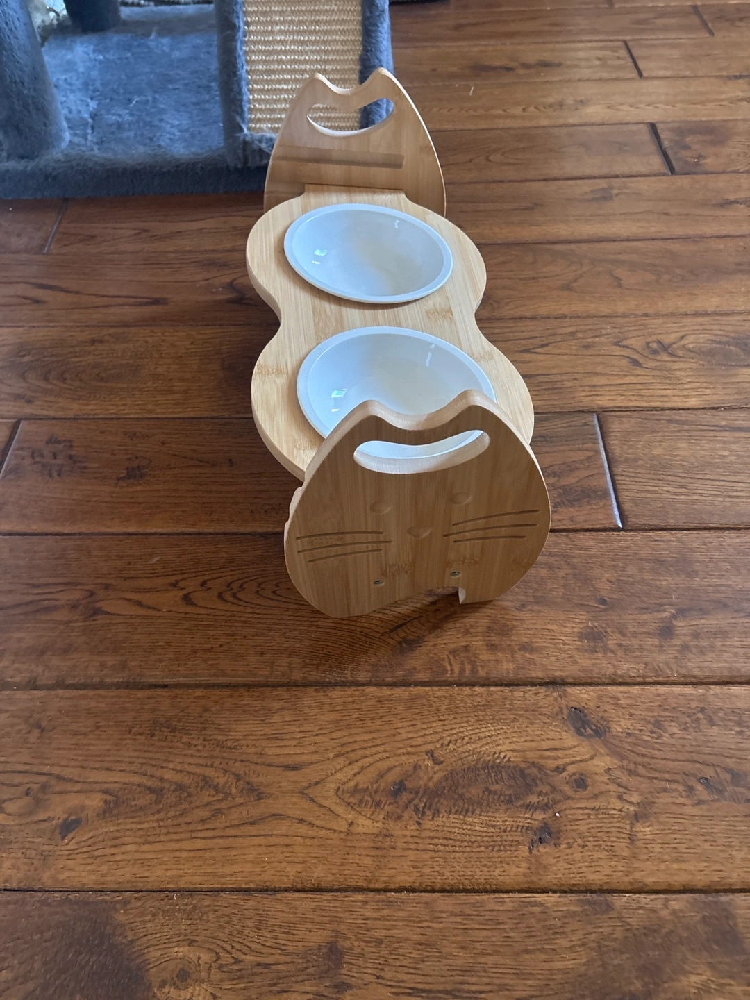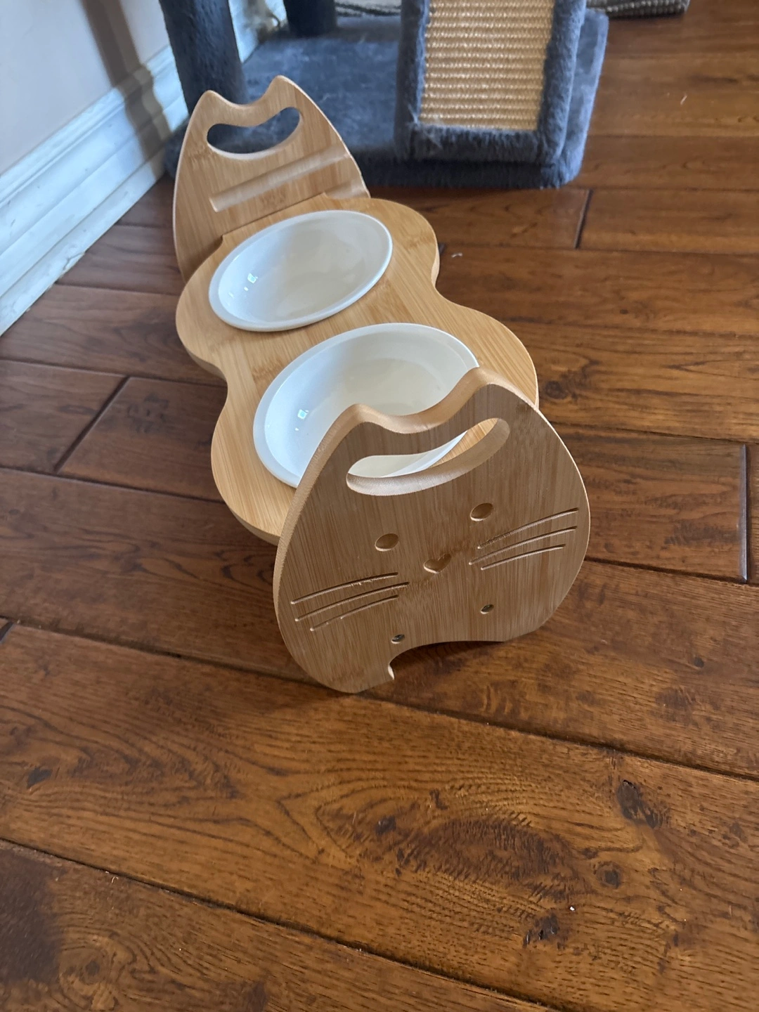 Elevated pet feeder. Two ceramic bowls. Bamboo stand. Cat face design. Perfect for cats or small dogs.