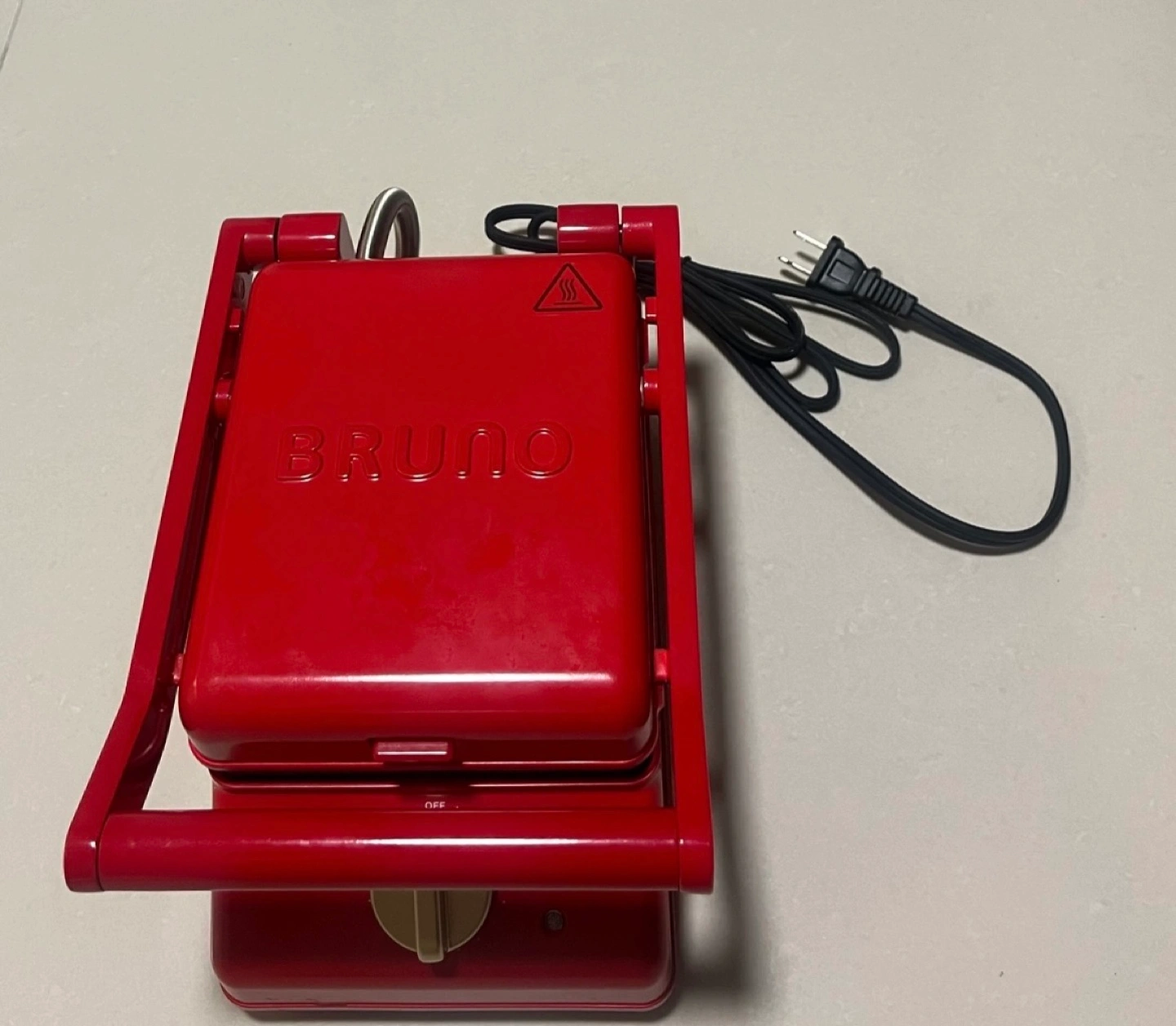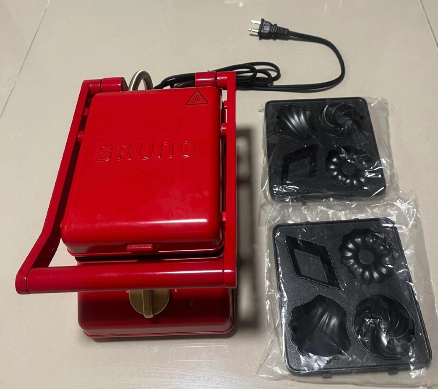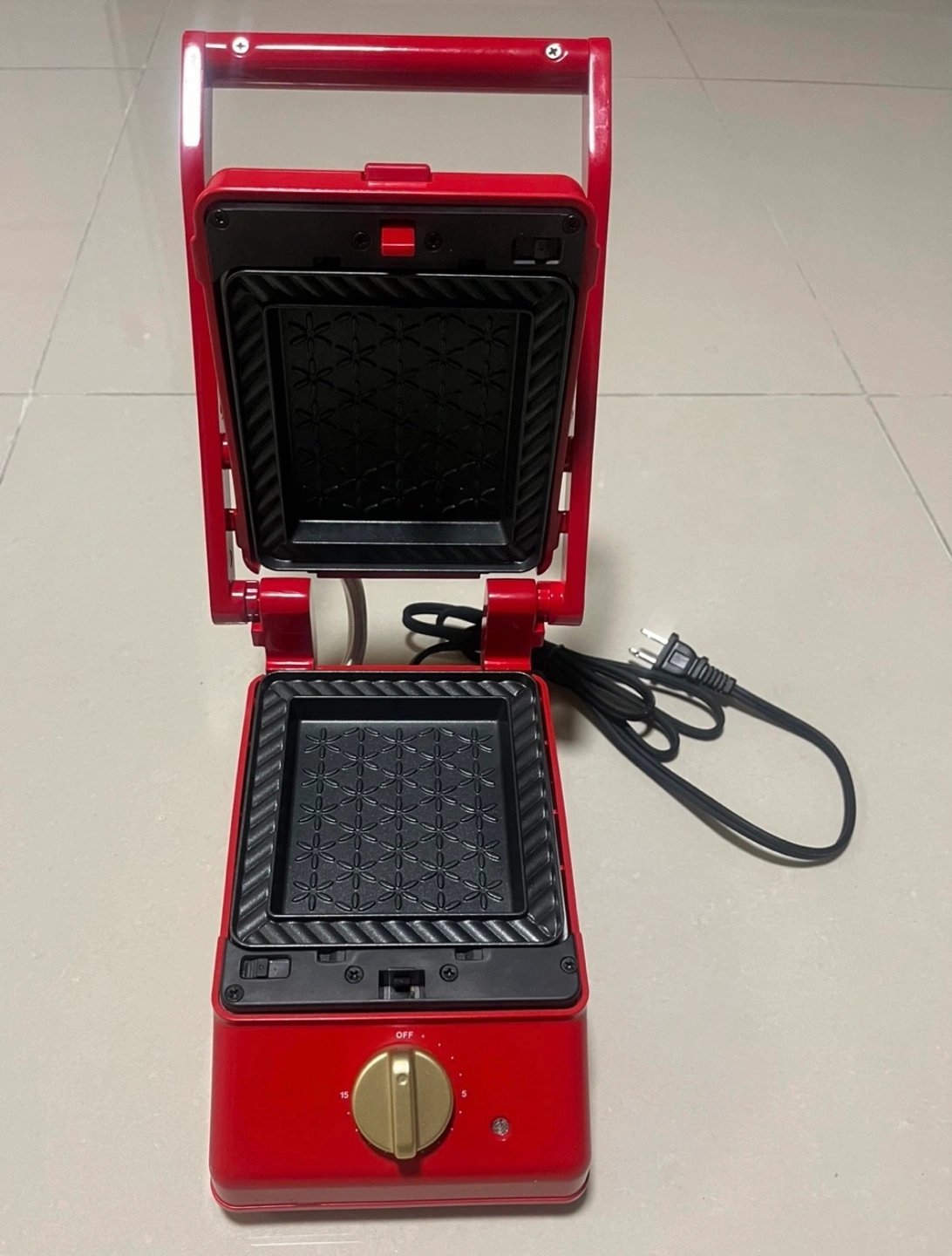 Red electric grill with interchangeable plates. Includes two extra plates, one for making various shapes and one for making squares.