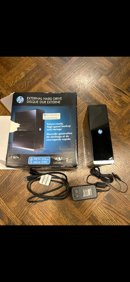 External hard drive, 1TB capacity. Includes USB cable and power adapter. Box included. HP external hard drive 1 Tb Box opened, never use. selling for friend 📍North York Centre Station (message for times) 📍finch station (4-6pm, times will vary) 📍hilda avenue & steeles avenue(after 5pm & weekends) 📍queen's park (8:30-4:30pm weekdays)