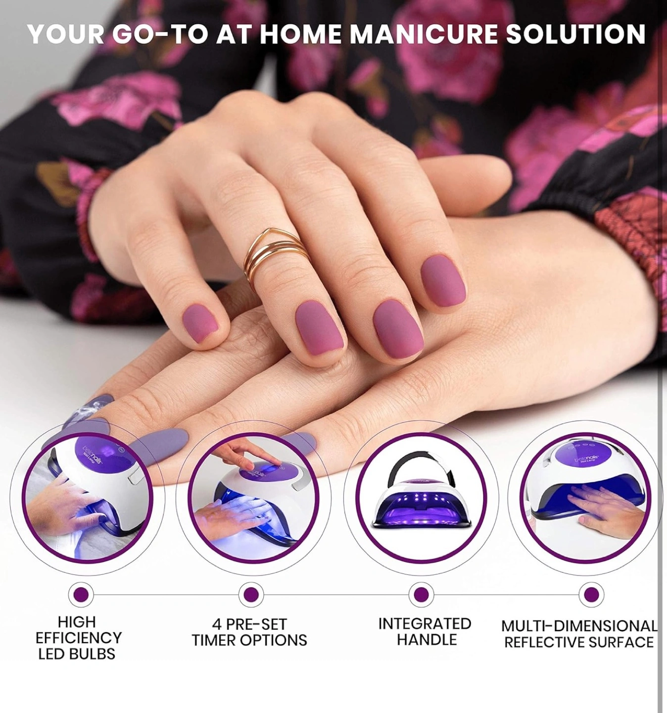 Portable nail lamp. 120W LED bulbs. Four pre-set timer options. Elegant design. Perfect for home manicures. Includes integrated handle for easy transport.