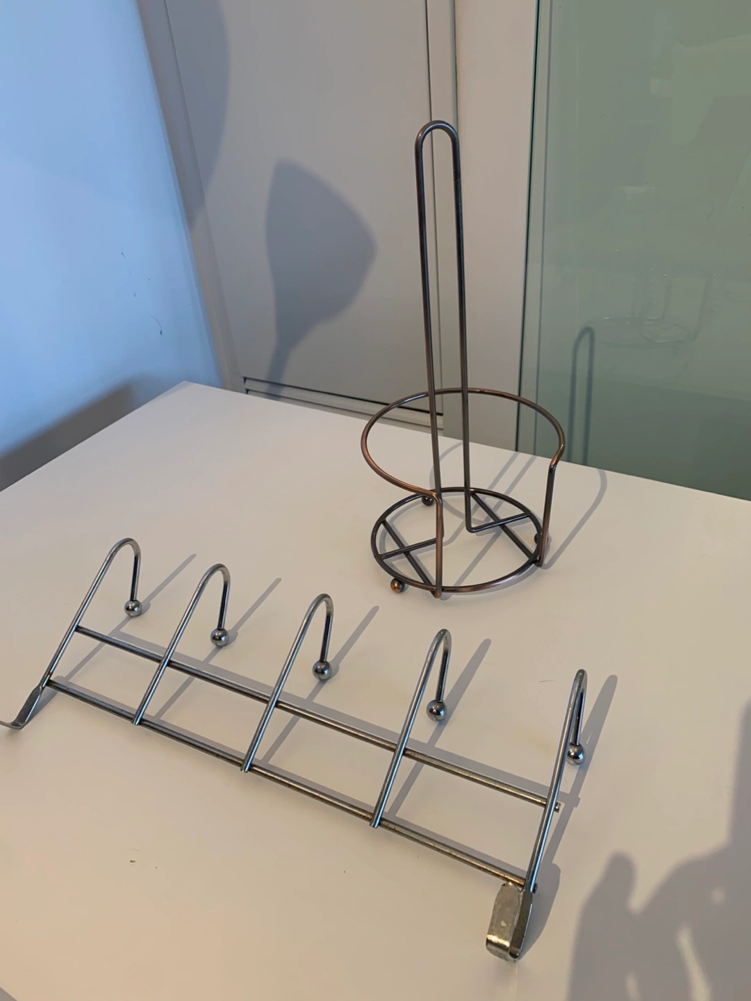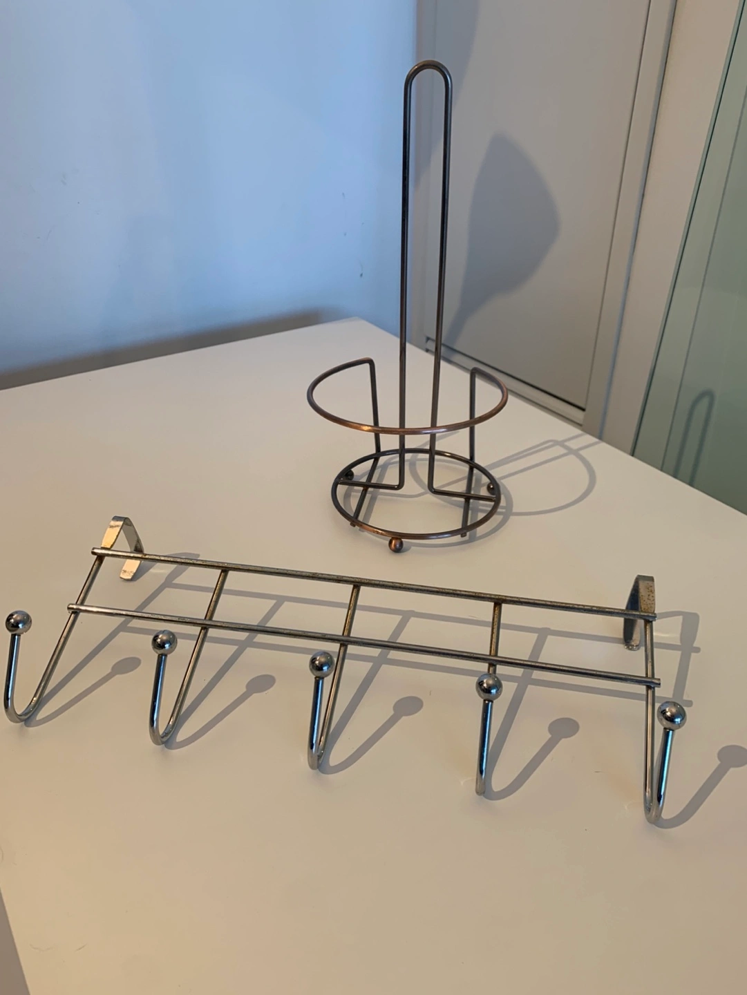 1000+Set includes a copper-toned paper towel holder and a chrome hook rack. Both are made of metal. Great for kitchens, entryways, bedroom, washroom, etc. Minimalist design. Minimal signs of wear and tear. Pick-up and cash only. No holds. 💛~Look at my other listings for great bundle discounts.